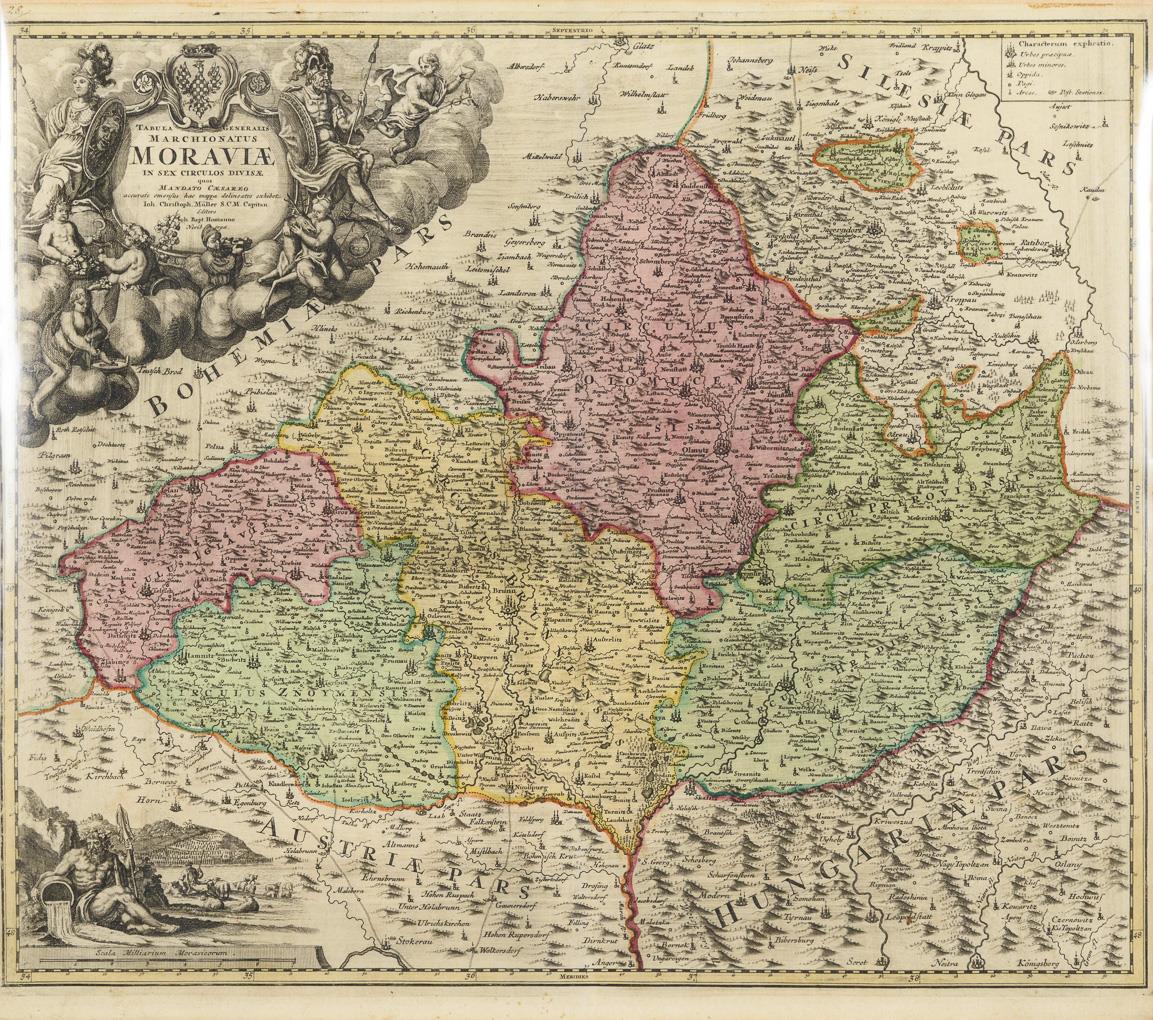 "Tabula Generalis Marchionatus Moraviae". Tschechien, umgeben von Böhmen, Schlesien, Ungarn und Österreich; mit allegorischer Darstellung von Flussgottheiten unten links und Kriegsgottheiten oben links, vermutlich Minerva und Mars, kartografiert von Johann Christoph Müller (1673 Wöhrd - 1721 Wien), herausgegeben von Johann Baptist Homann (später Verlag Homann Erben - Homannianis Heredibus). Beschnitten.