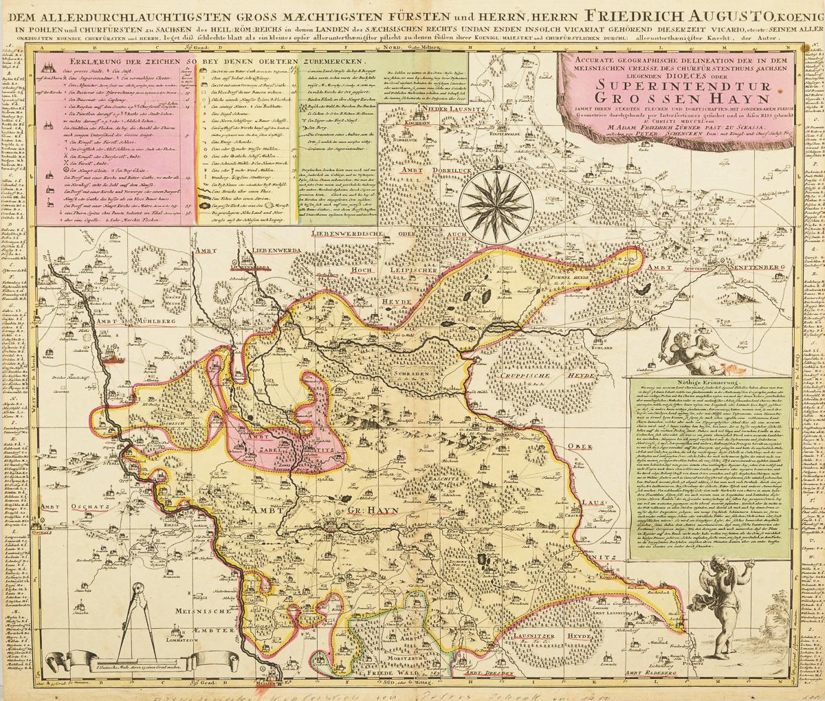 Karte der sächsischen Besitztümer unter Friedrich August, König von Polen und Kurfürst zu Sachsen. Kartografiert von Adam Friedrich Zürner (1679 Marieney - 1742 Dresden) und Peter Schencken (1660 - 1718). fleckig, vermutlich beschnitten.