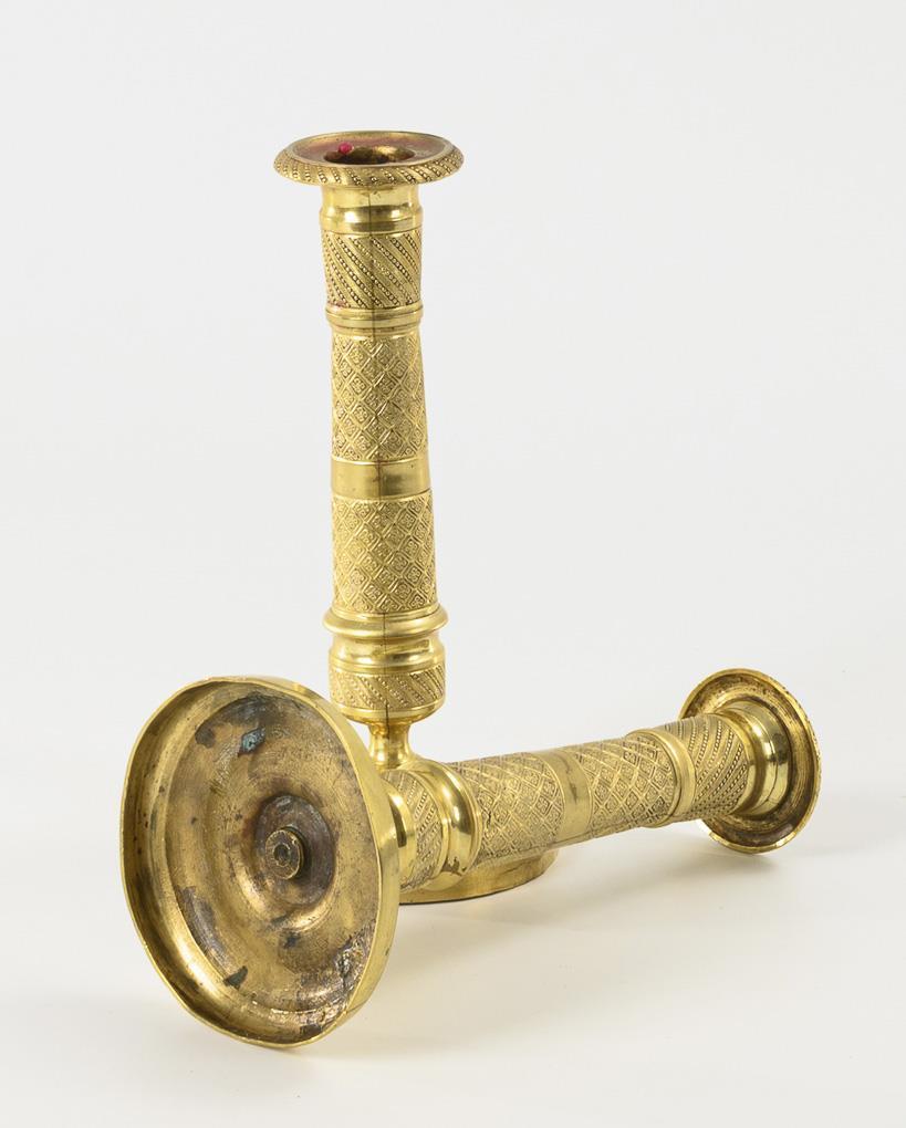 Sehr fein umlaufend ornamental verzierte Bronzeleuchter mit Rundfuß, Säulenschaft und Wachsteller. 1 unauffällige Lötreparatur am Fußrand, 1 Verschraubung alt repariert.