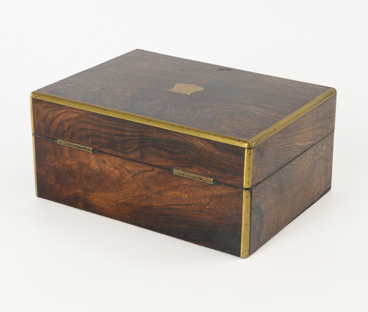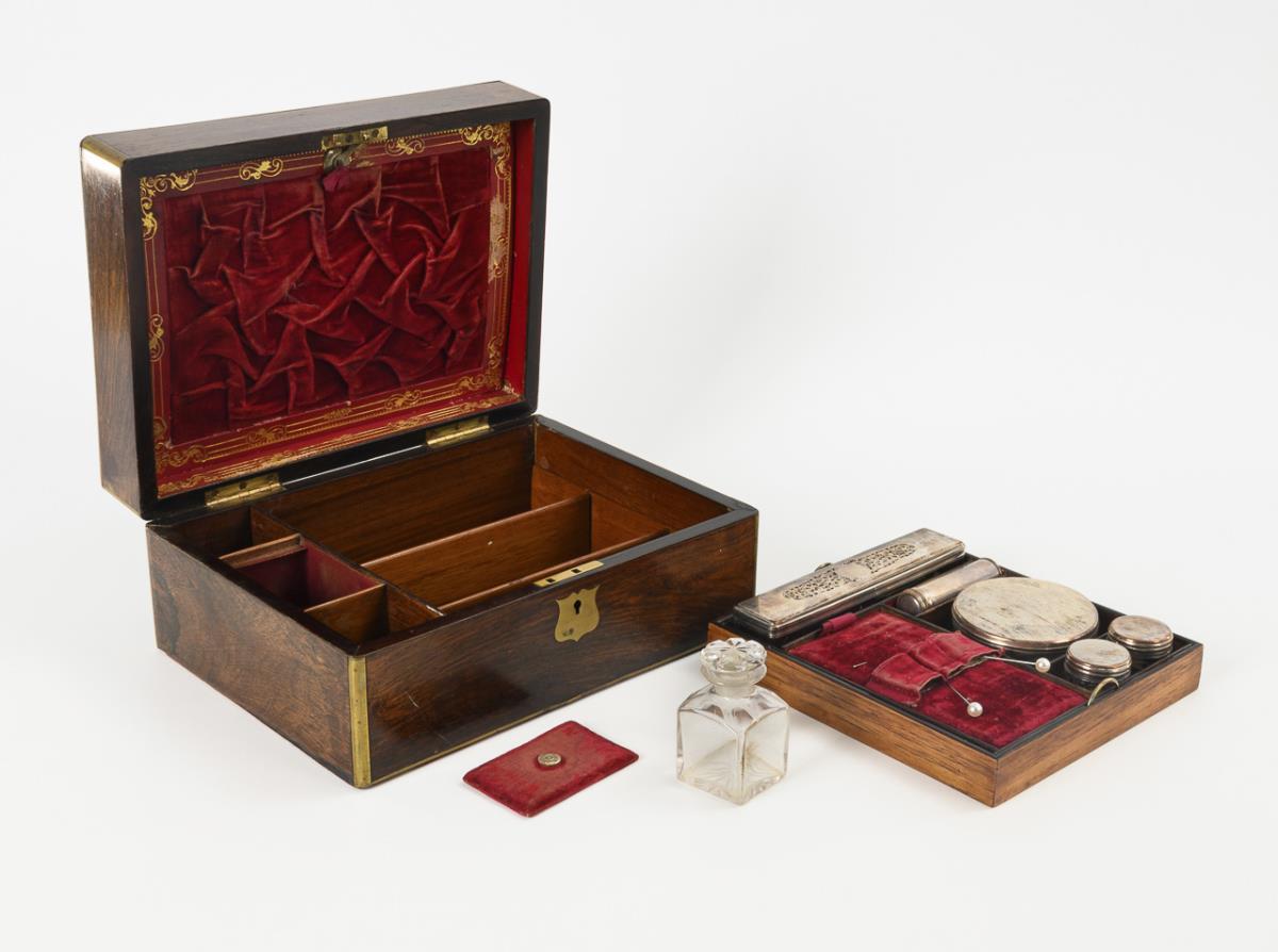 Quaderschatulle mit Messingeinlagen an den Kanten sowie leeres Wappenschild auf dem Scharnierdeckel bzw. als Schlüssellochblende. Im Deckel aufklappbares Dokumentenfach. Im Korpus Fachung mit verschiedenen Toiletten-Utensilien: Rasierpinsel und verschiedenen Dosen und Fläschchen. Dazu 2 Hutnadeln und 1 Patent-Nagelknipser mit -feile. Einige Alters-/Gebrauchsspuren, 1 Flasche fehlt.