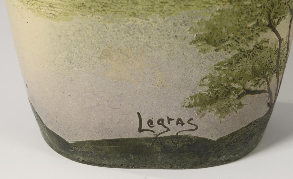 1x LEGRAS & CIE, signiert: Balusterplattvase aus farblosem Glas mit geätztem und polychrom emailstaffiertem Landschaftsdekor (H 15 cm). / 1x Flötenvase aus farblosem Glas mit vier aufschmolzenen, zu Fäden ausgezogenen Tropfen aus grünem Glas, ausgestellter, vierpassiger Mündungsrand (H 21 cm). Bestoßung am Mündungsrand der Legras-Vase.