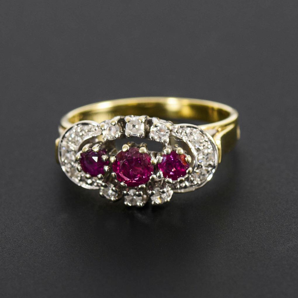Chatongefasste Rubin-Trilogie, umgeben von 12 Brillanten (je sechs chatongefasst bzw. eingelassen). Schmale Schiene.