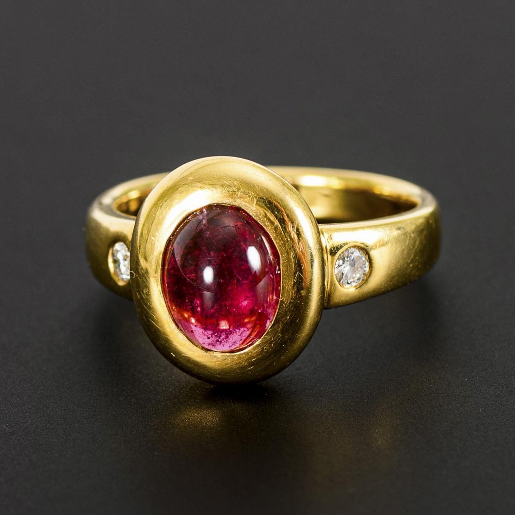 Zargengefasster Rubellitcabochon und 2 eingelassene Brillanten zwischen mittlerer Schiene.