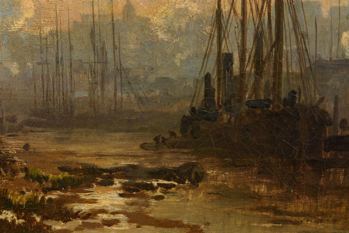 Schiffe im Hafen bei atmosphärischem Dunst vor der nur schemenhaft erkennbaren Stadt an einem sonnigen Tag. Altersspuren.
