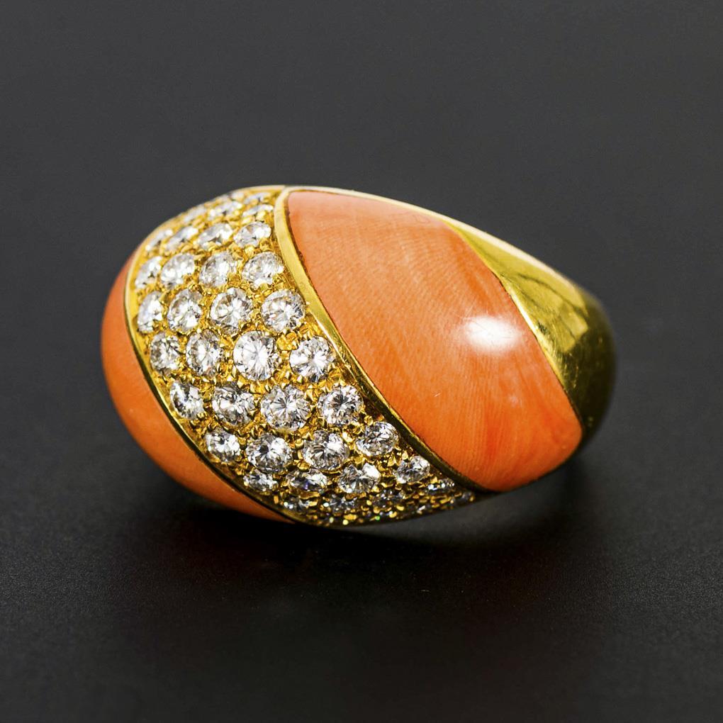 Massiver Ring mit angepassten Korallensegmenten und 44 pavégefassten Brillanten. Breite Schiene.