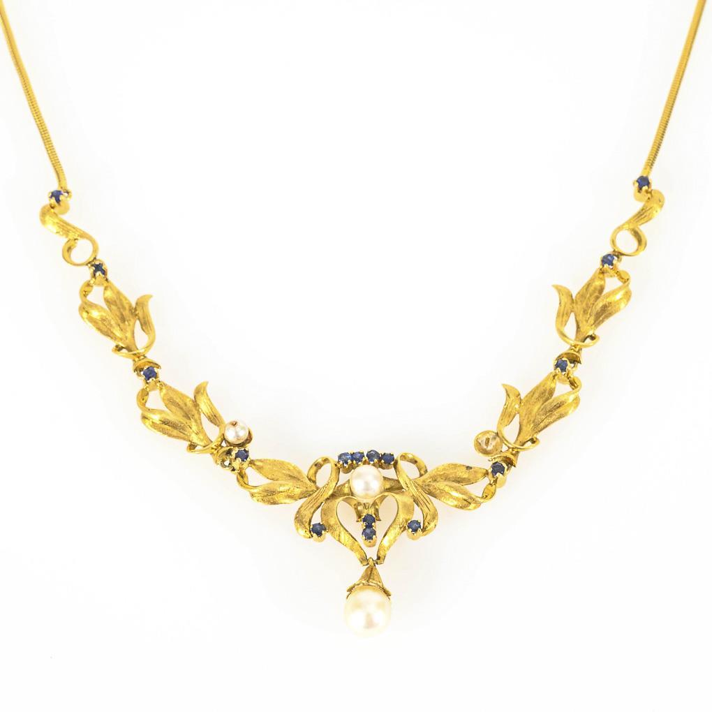 Aufwendig floral, graviertes Mittelteil mit gefasster und abgehängter Zuchtperle sowie 16 kleinen Saphiren, zwischen Schlangenkette mit Hülsenschloss und Achtersicherung. 1 Kunstperle ergänzt, 1 Perle fehlt.