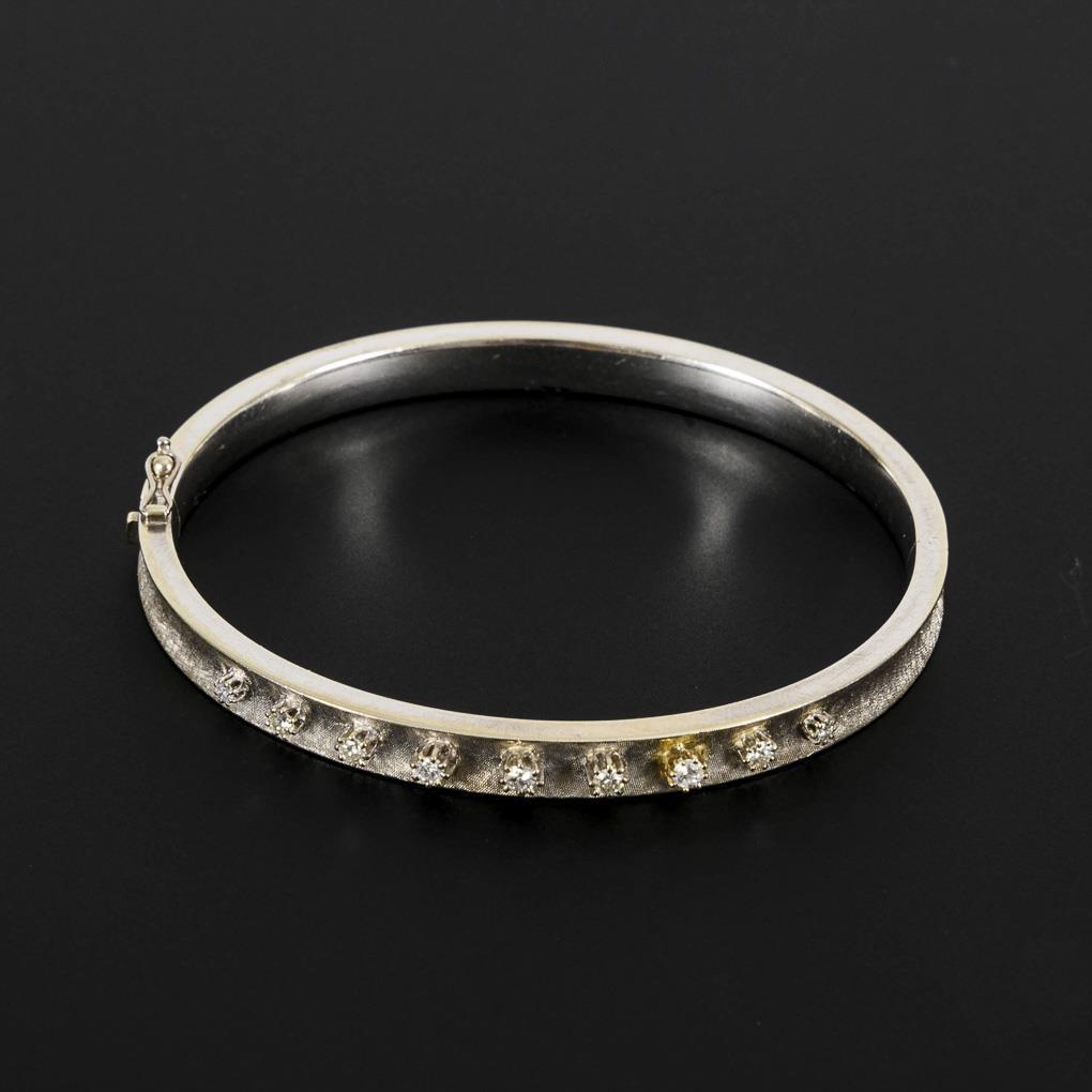 Weißgold 590 gestempelt. 1 Chaton Gelbgold verbödet?. Brillanten zus. ca. 0,35 ct. Ø 6 cm. 15,1 g.