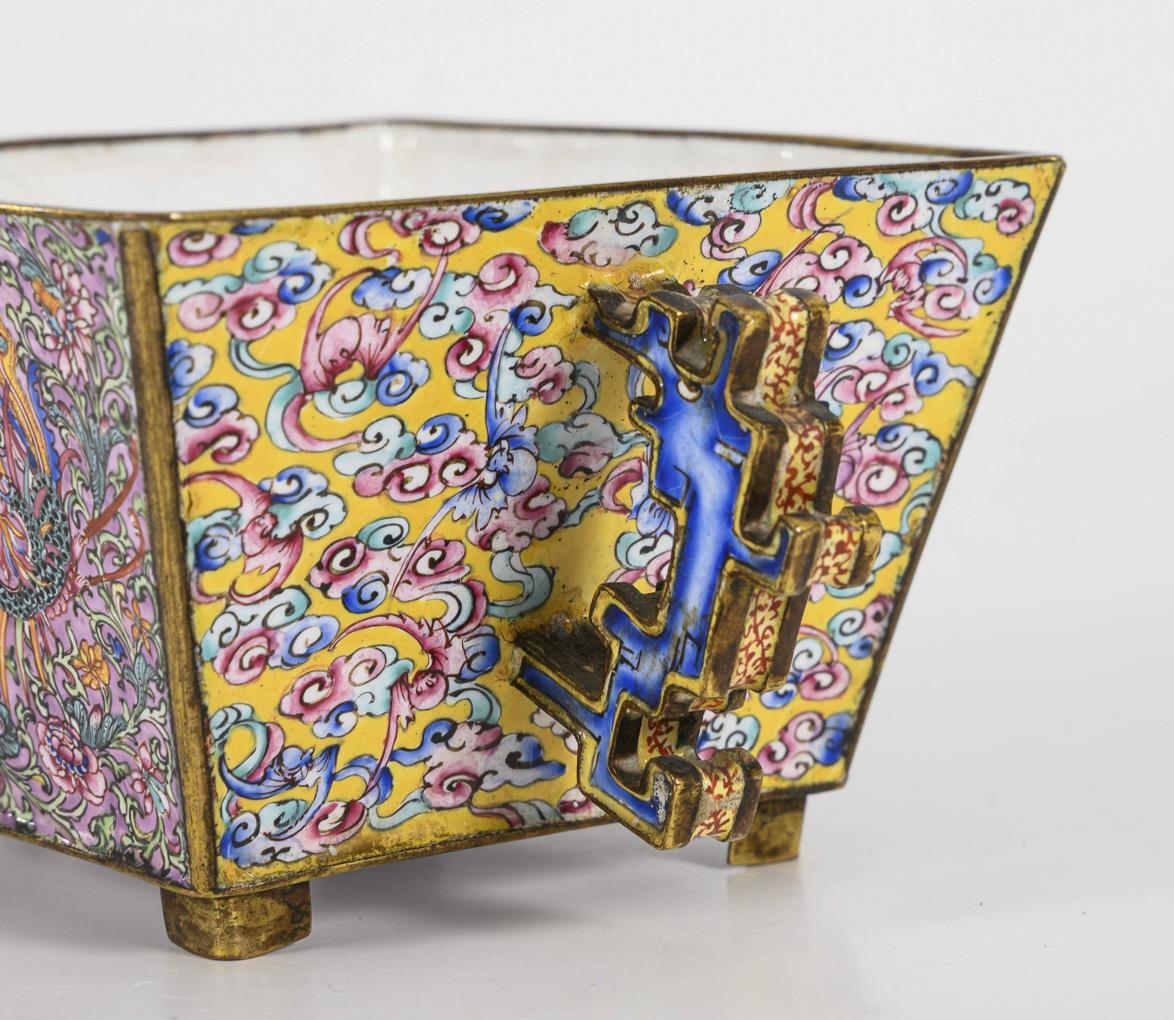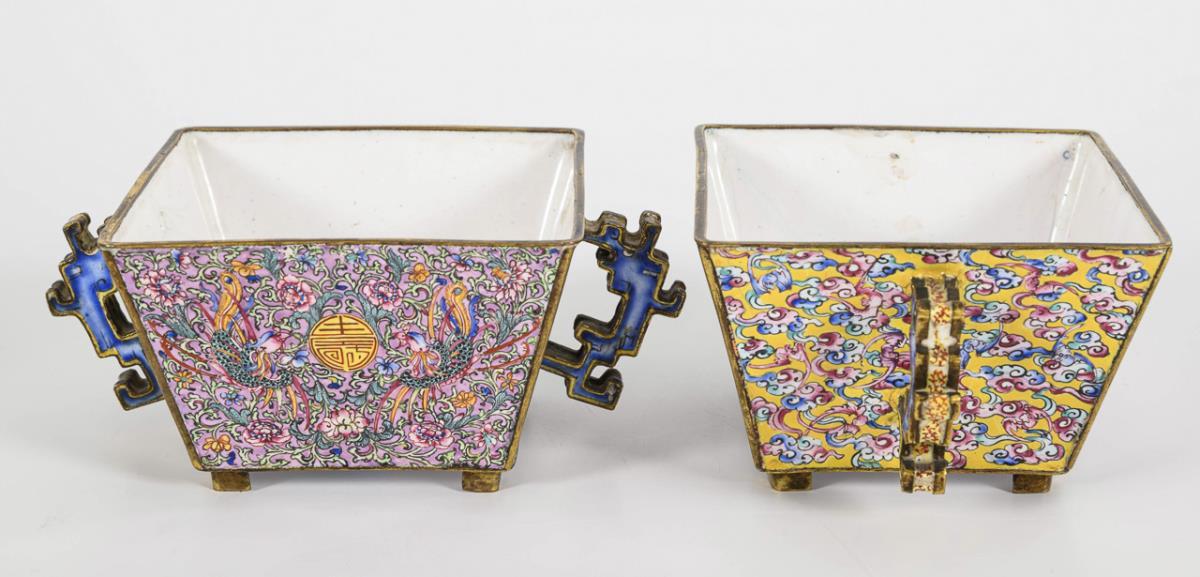 Sehr filigrane, polychrome Bemalung mit zentralem shu-Zeichen, flankiert von Phönixen zwischen Blumenranken. Seitlich stark stilisierte Drachengriffe auf gelbem Untergrund mit Wolkenornament. Innen weiß emailliert, mit kleinem Blumenstück und Fledermaus. Mit Resten von Vergoldung an den Kanten, jüngere Holzsockel. Altersspuren, Innen: etwas rissig und Reparaturstellen. Außen gut erhalten.