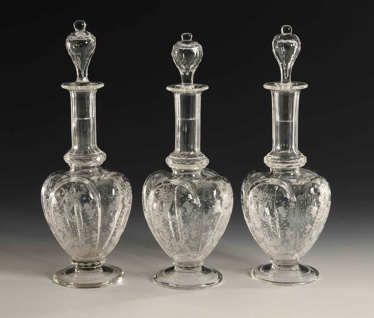 56 Teile. Teils vierpassige Form, mit qualitätvoll graviertem Floral- und Rocaillendekor. 3 Karaffen (H 29,5, 30 und 30,5 cm). Mit Glockenkuppa: 12 Rotweingläser und 14 Wassergläser. Mit vierpassiger Kuppa: 12 Weißweingläser und 15 Biergläser.