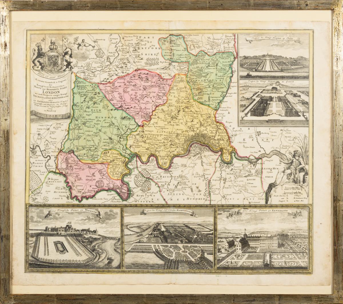 Detailierter Plan von London aus der Vogelperspektive, Titelkartusche: "Accurater Grundriß u. Gegend der Koenigl. Groß-Britannischen Haupt und Residentz-Stadt London wie auch Prospecte einiger Koenigl. Palläste u. Lust-Schlösser derselbe edirt [...]", im unteren Bereich 3 Ansichten: "Der Königliche Palast zu Windsor", "Prospect des Königl. Lust-Schlosses Hampton Court" und "Der Königl. Palast zu Kensington", oben rechts Ansicht "Prospect des Königl. Hospitals zu Chelsey" und "Prospect des Königl. Hospitals zu Greenwich". Bugfalte, etwas stockfleckig und an den Rändern verschmutzt, kleine Defekte durch Risse und Knicke.