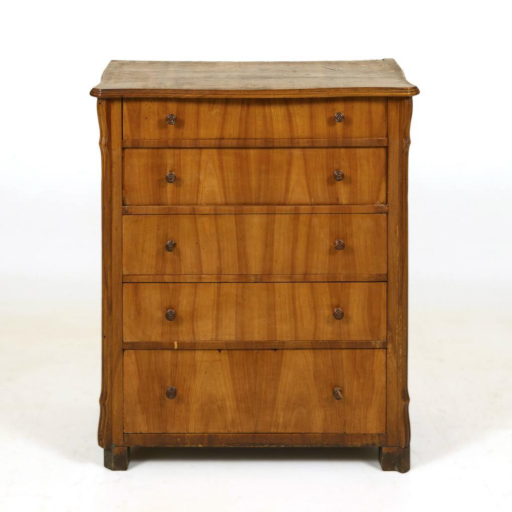 Chiffoniere mit 5 größendifferenten Schüben, geschweifter Deckplatte mit Profilkante, geschrägten Ecken mit Wellenkante, auf 4 Klotzfüßen. 4 Schübe mit Binnenfachungen. Runde Drechselknäufe aus Holz. Alt restauriert, Alters- und Gebrauchsspuren, mit Defekten und Fehlstellen, teils rissig.