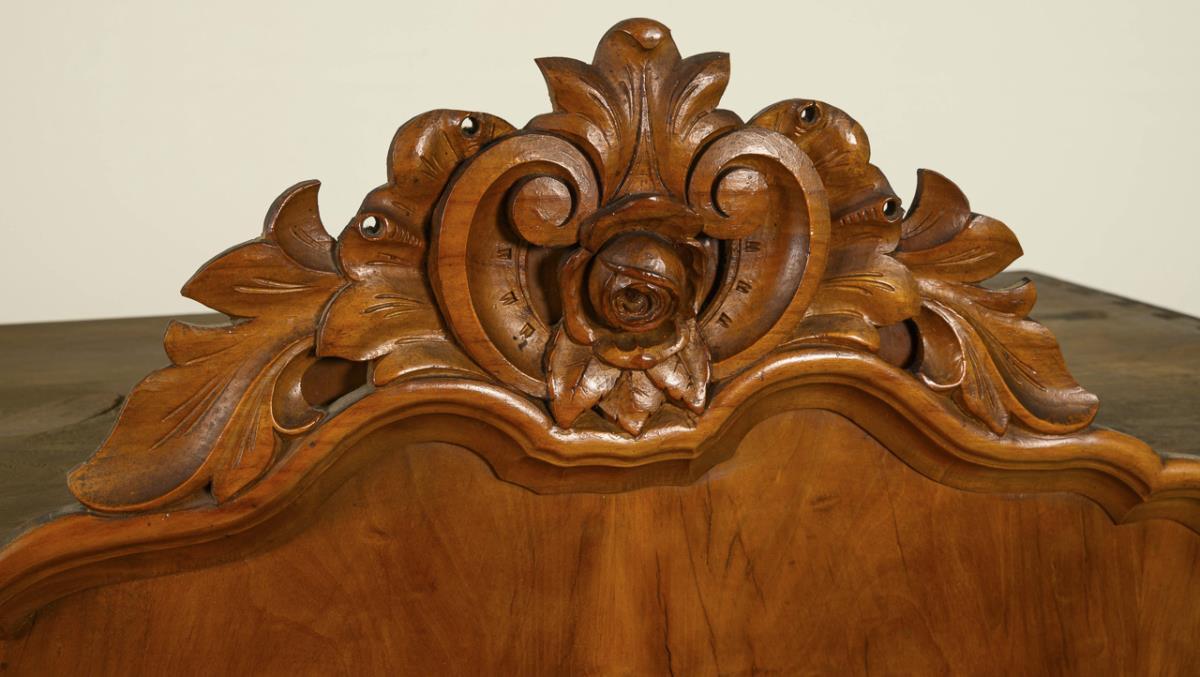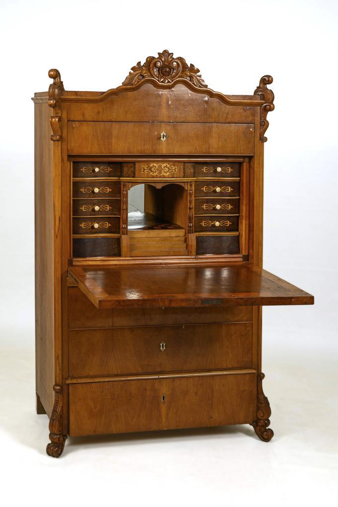 4-schübiger Sekretär mit queroval kassettierter Schreibklappe, floral beschnitzter Bekrönung, geschrägten Ecken mit Volutenzier, auf Klotz- und Volutenfüßen. Eingericht mit offenem Mittelfach mit Schachbrettboden und rückseitiger Verspiegelung, flankiert von jeweils 3 seitlichen Schüben, 1 Kopfschub und 1 Sockelschub mit Treppe zum Mittelfach, verziert mit floralen Intarsien. Beinknäufe und Schlüssellochbeschläge aus Bein. Partiell Furnierfehlstellen und Defekte, Spiegelglas gesprungen, Schlüssel der Schreibplatte fehlend.