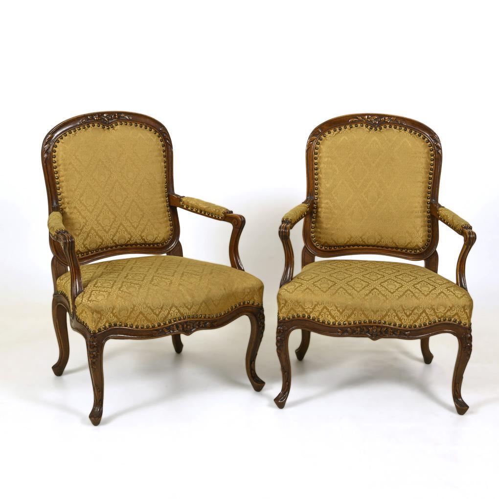 Breite Sessel mit gekehlten Rahmen, Voluten und floraler Schnitzzier, Polsterung an Rückenlehne, Sitzfläche und Armstützen mit ockerfarbenem Jacquard-Stoffbezug, polsternagelgerändert. Leichte Alters- und Gebrauchsspuren, partiell kleine Defekte.