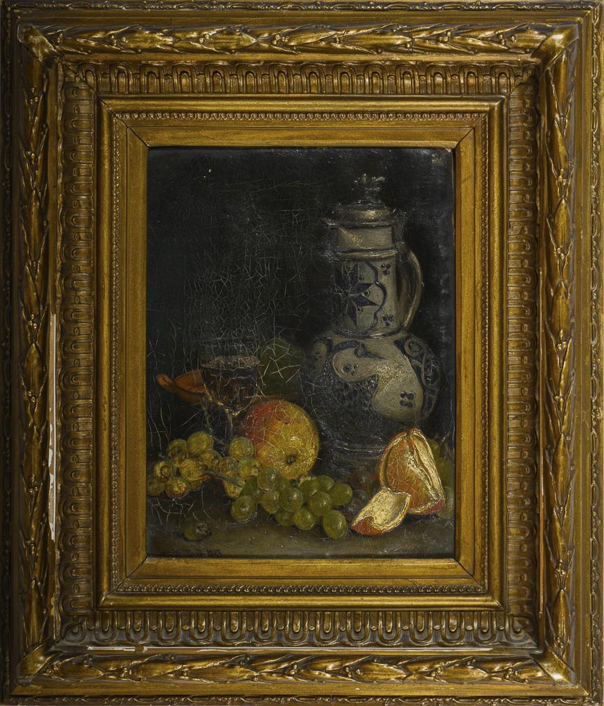 Trauben, Apfel und Orange neben einem Glas und einem Krug auf dem Tisch. Altersspuren.