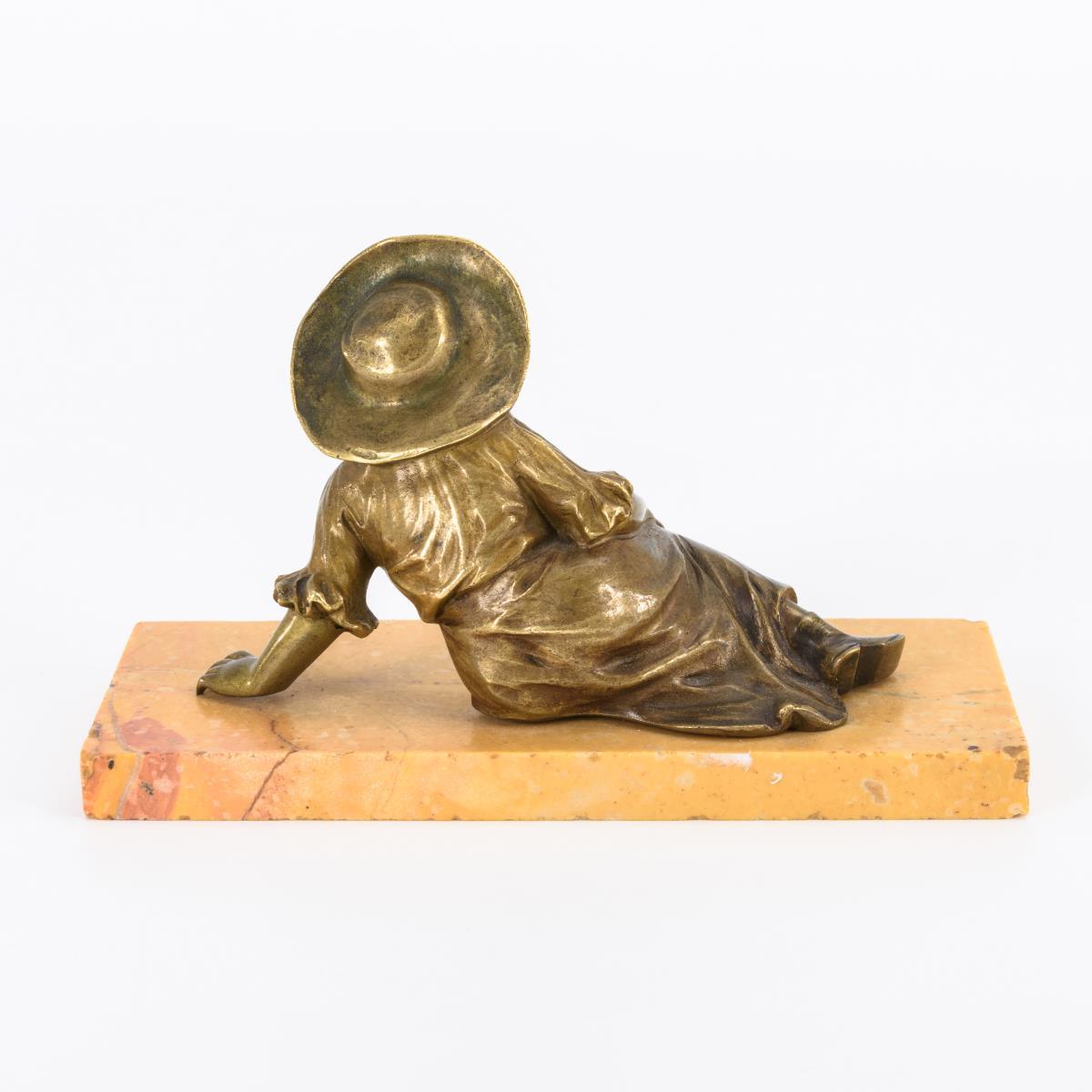 Auf dem Boden lagerndes Mädchen mit breitkrempigem Hut. Wenige Alters- und Gebrauchsspuren.