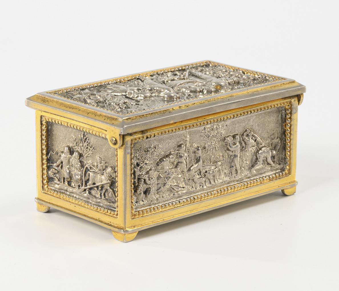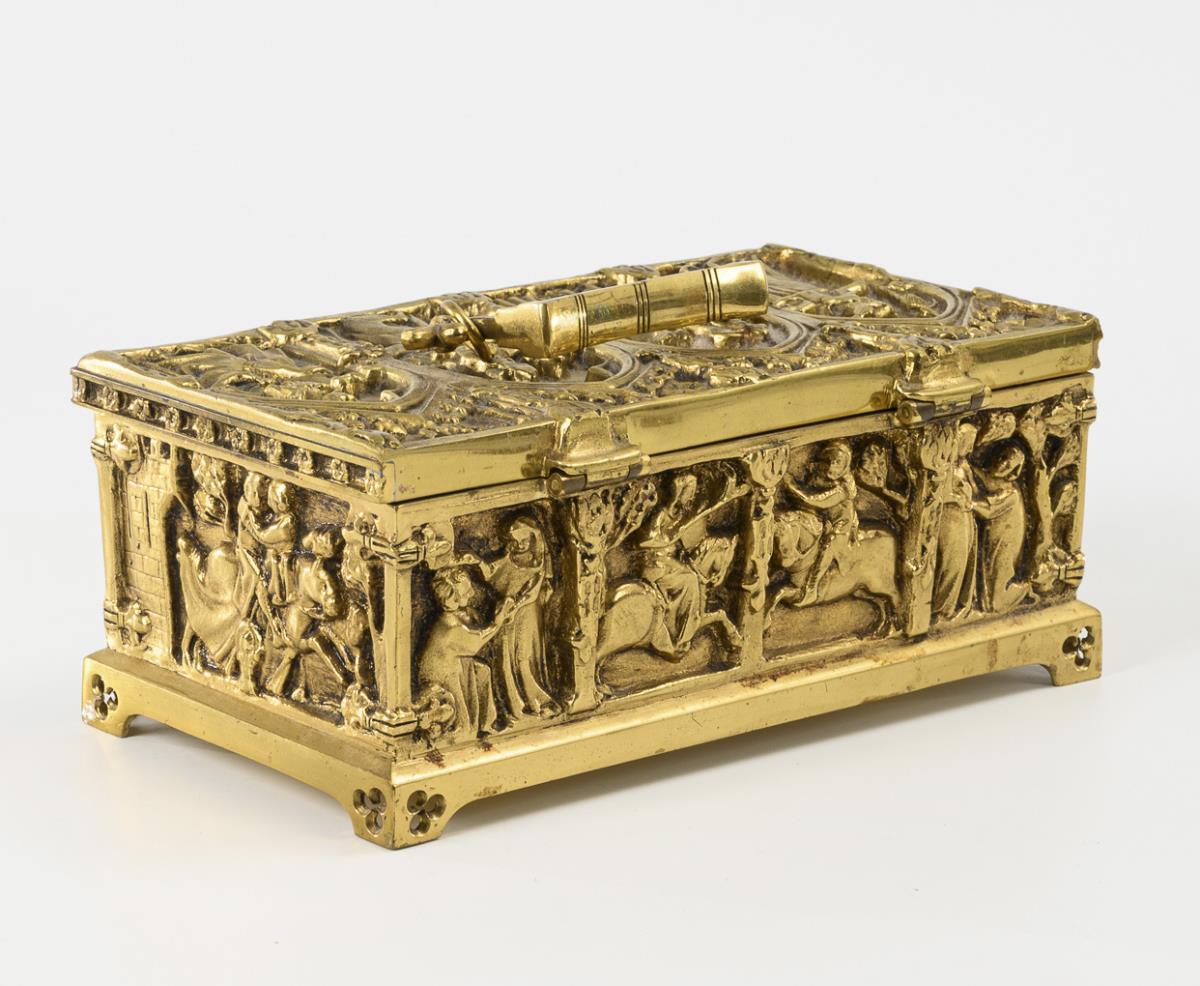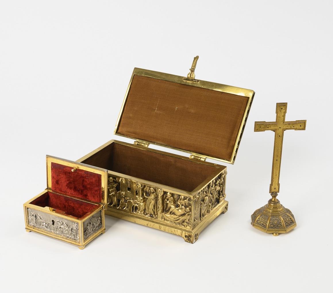 Große ungemarkte Bronzeschatulle (wohl Erhard & Söhne) allseits und auf dem Scharnierdeckel überaus reich im Stil der Gotik reliefiert: Anbetung der Könige bzw. Minne- und Ritterszenen. / Kleine Schatulle auf dem Scharnierdeckel und allseits reich mit bäuerlichen Szenen reliefiert. / Fein ornamental mit Filigran-Imitat verziertes Standkreuz. 1x Stoff innen minimal beschädigt.