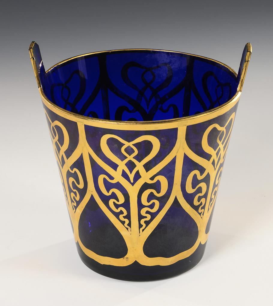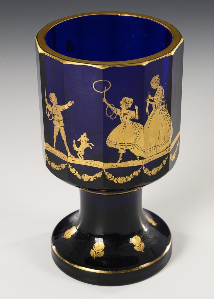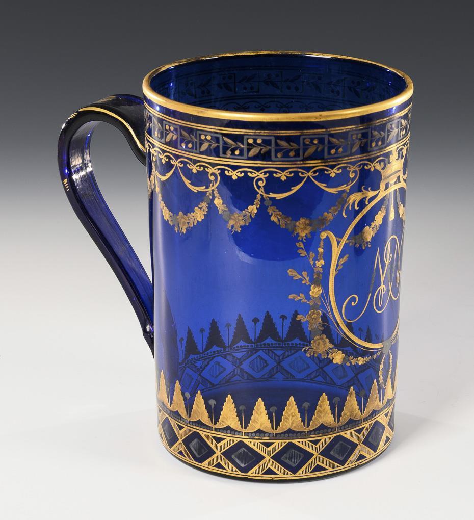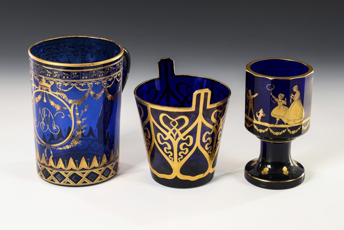 1x um 1790: seltener großer Walzenkrug mit Bandhenkel, goldgemalten und goldgravierten Ornamenten sowie dem schauseitigen, kyrillischen Monogramm "MP" (H 18 cm). /2x 19. Jh./Anfang 20. Jh.: großer, konischer Becher in Form eines Bottichs mit Goldornamentik, irisiert (H 15 cm) und schweres Kelchglas mit facettierter Zylinderkuppa, Zylinderschaft und Rundfuß sowie der schauseitigen, goldgemalten Darstellung einer Mutter mit Hund und spielenden Kindern (H 16 cm). Kleiner Spannungsriss am unteren Henkelansatz des Bierkruges, partiell minimaler Goldabrieb.