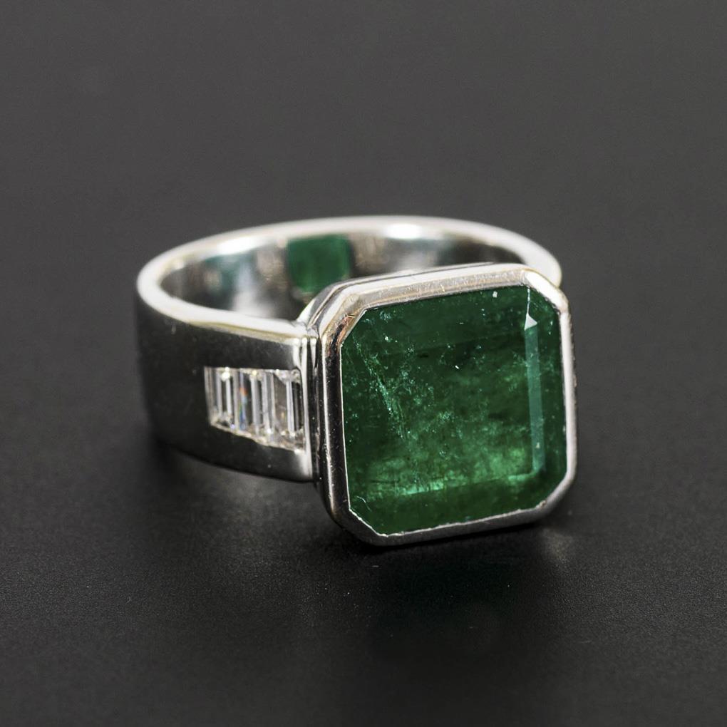 Großer, zargengefasster, moosgrüner Smaragd zwischen 6 eingelassenen Diamantbaguetten und breiter Schiene.