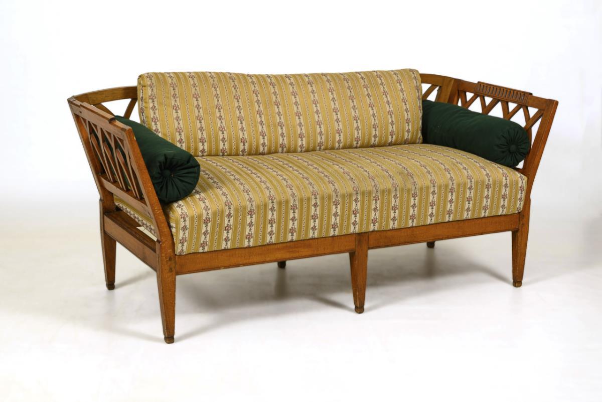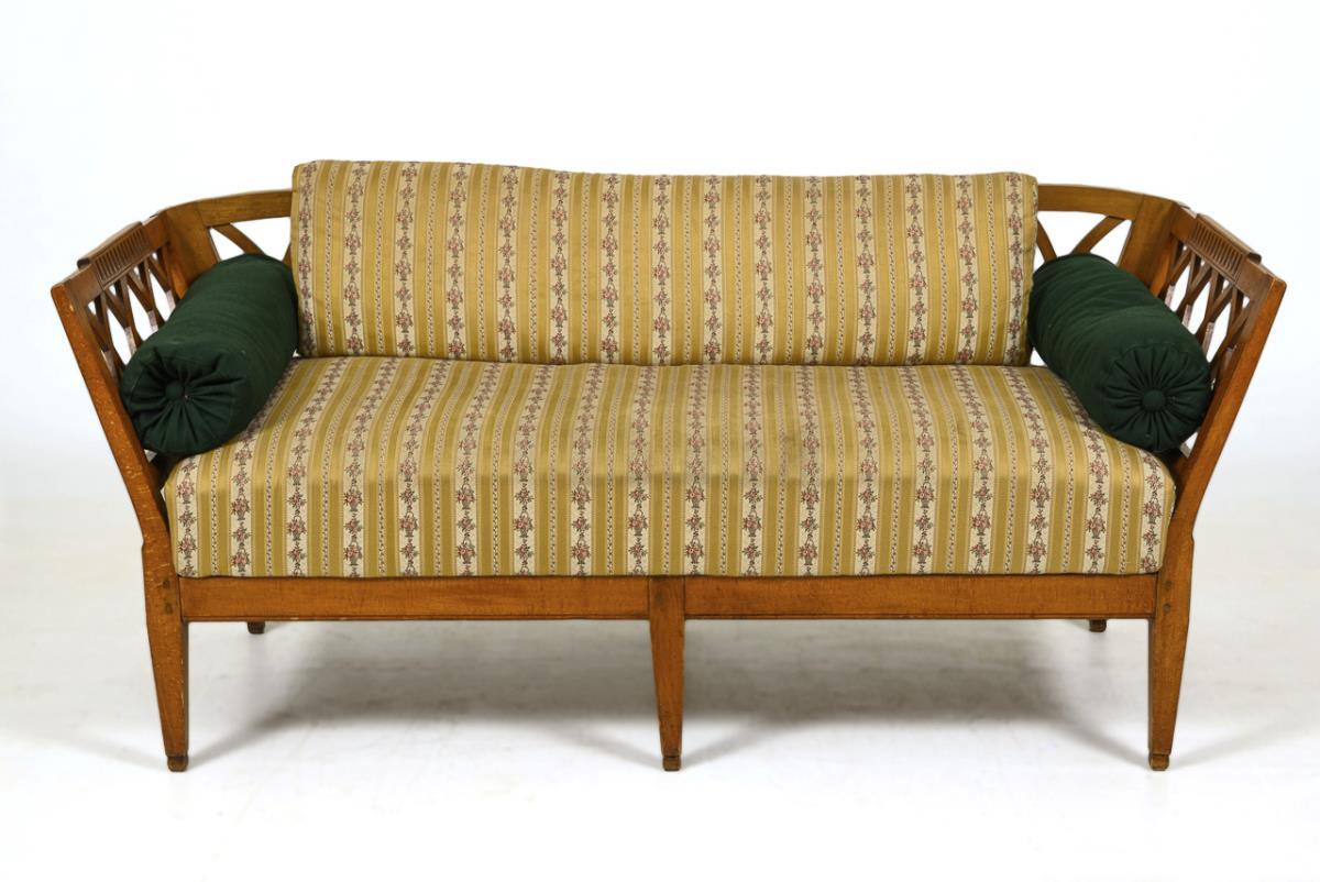 Gerader, rückseitig leicht gerundeter Lehnenabschluss mit Vertikal- und Kreuzverstrebungen, Seitenstützen mit kerbgeschnitzter Zierleiste, auf 6 konischen Vierkantbeinen. Jünger ergänzte Polsterung mit geblümt-gestreiftem Stoffbezug, passend ergänztes Rückenpolster, 2 Seitenkissenrollen mit grünem Stoffbezug. Leichte Alters- und Gebrauchsspuren.