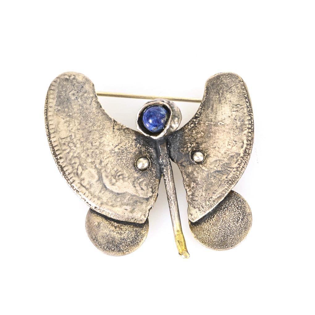 Stilisierte Schmetterlingsbrosche mit zargengefasster Steinkugel. Hakenverschluss.