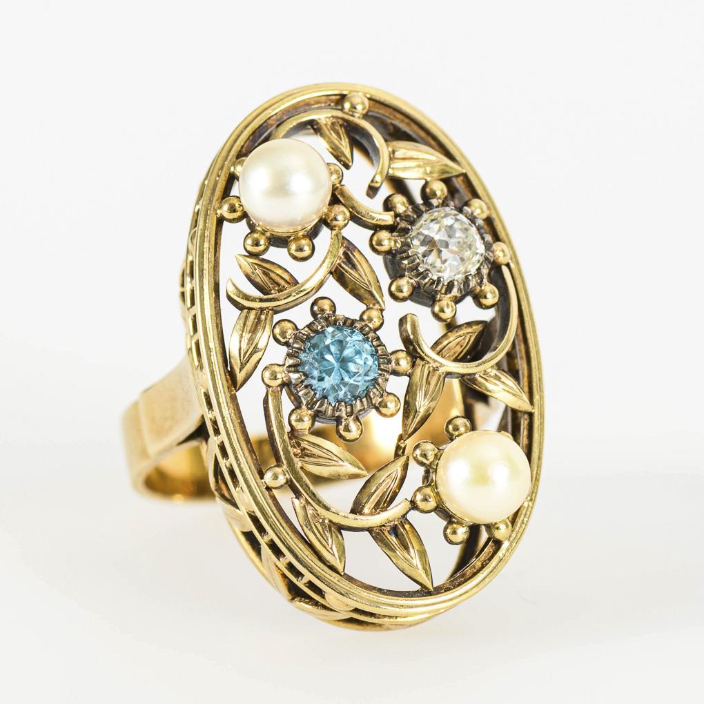 Ring mit Zuchtperlen, Altschliff-Brillant und blauem Stein.