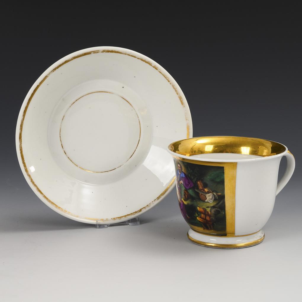 Polychrom bemalt, goldstaffiert. Tasse (H 8,5 cm), ergänzte Untertasse (Ø 16,5 cm).