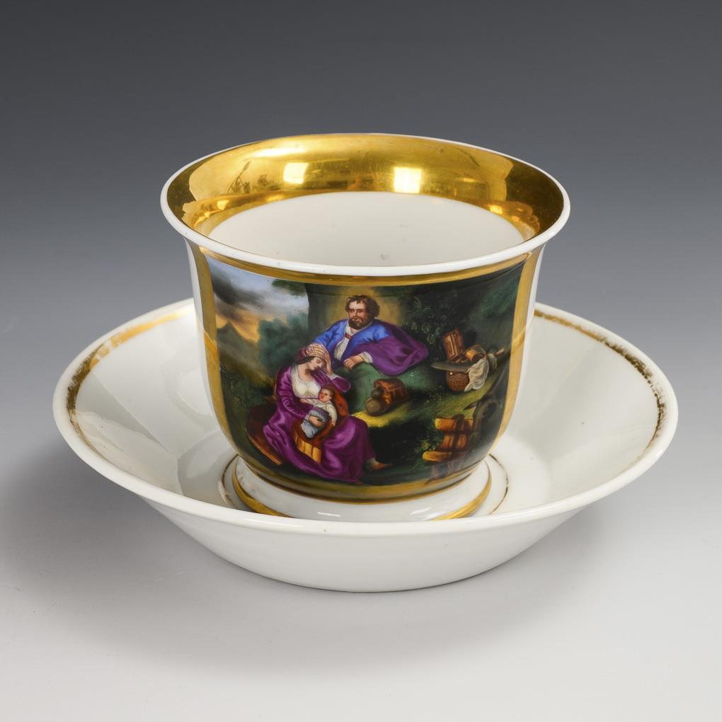 Glockentasse mit Ohrenhenkel. Schauseitig eine goldgerahmte Rechteckkartusche mit der Darstellung der auf der Flucht rastenden Heiligen Familie. Gold der Untertasse berieben.