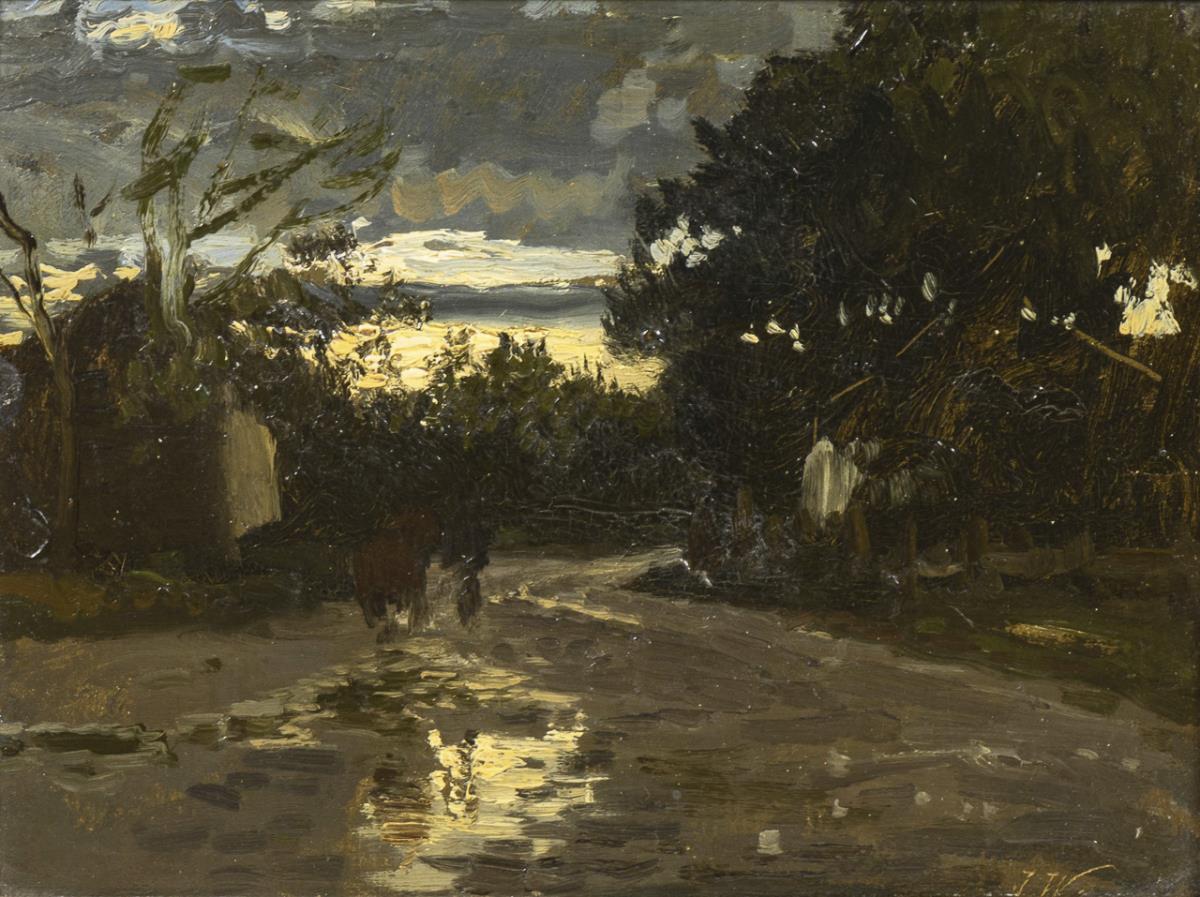 Impressionistische Studie mit Staffagefigur auf regennassem Weg vor einem Waldgebiet nach Sonnenuntergang.