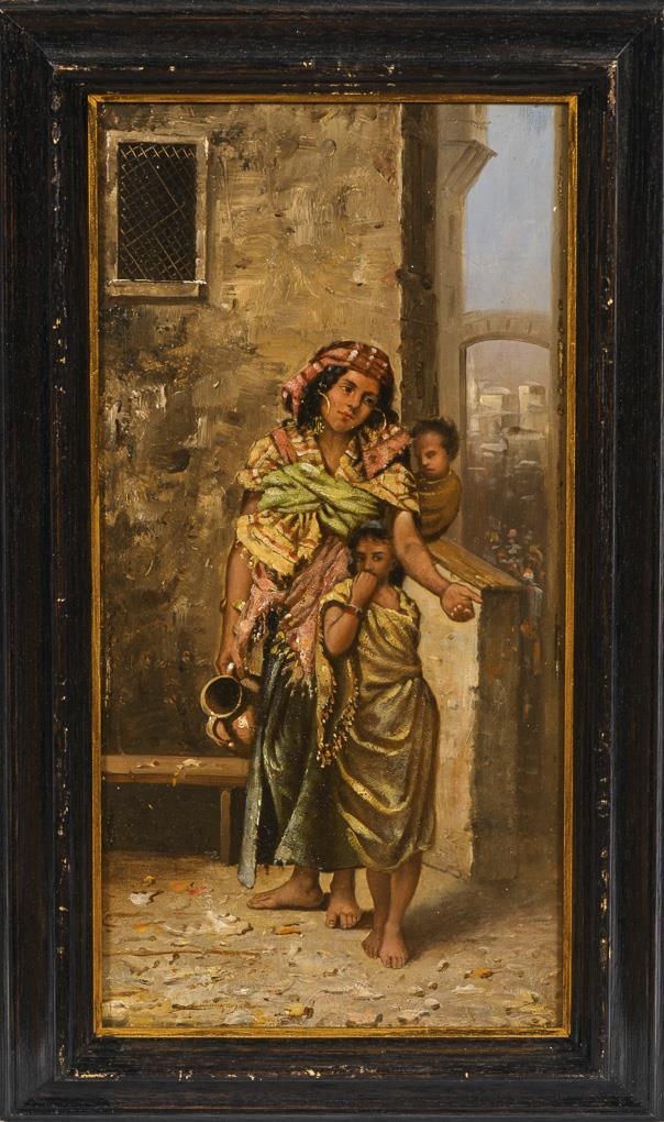 Junge Mutter mit Tochter und kleinem Sohn an einer Mauer im Sonnenschein.