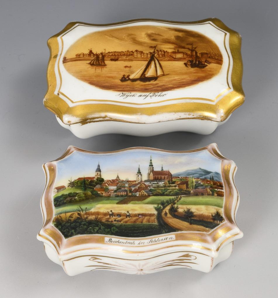 Rechteckige Dosen mit mehrpassiger Wandung, auf der Deckelunterseite je eine Reibefläche für Zündhölzer. 1x undeutliche Blaumarke: auf dem Deckel die sepiagemalte, bezeichnete Ansicht der Stadt Wyk auf der Nordseeinsel Föhr (3,5 x 9,3 x 6,5 cm). / 1x ungemarkt: auf dem Deckel die bezeichnete Ansicht der Stadt "Reichenbach in Schlesien" (3 x 8,5 x 6 cm). Partieller Goldabrieb.