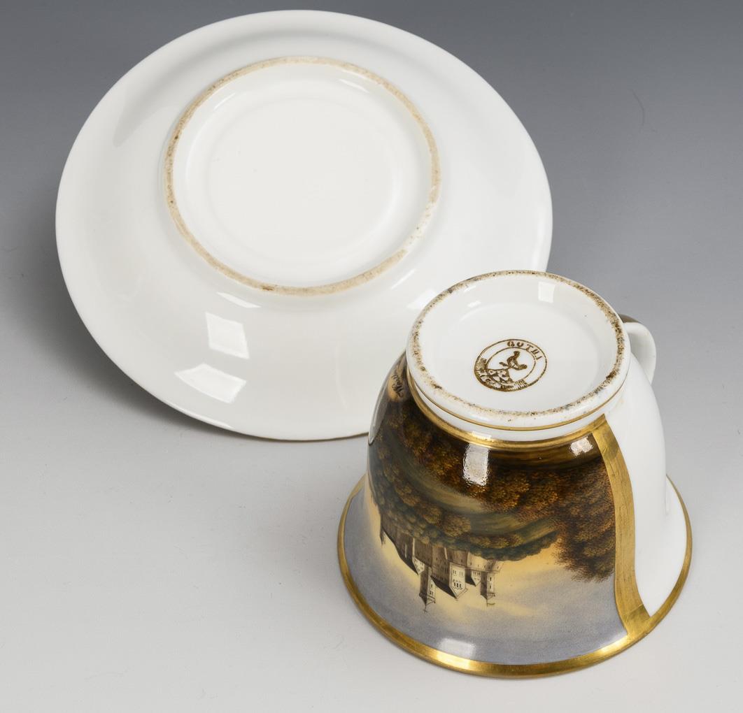 Polychrom bemalt, goldstaffiert. Tasse (H 7 cm), ergänzte Untertasse (Ø 14 cm).