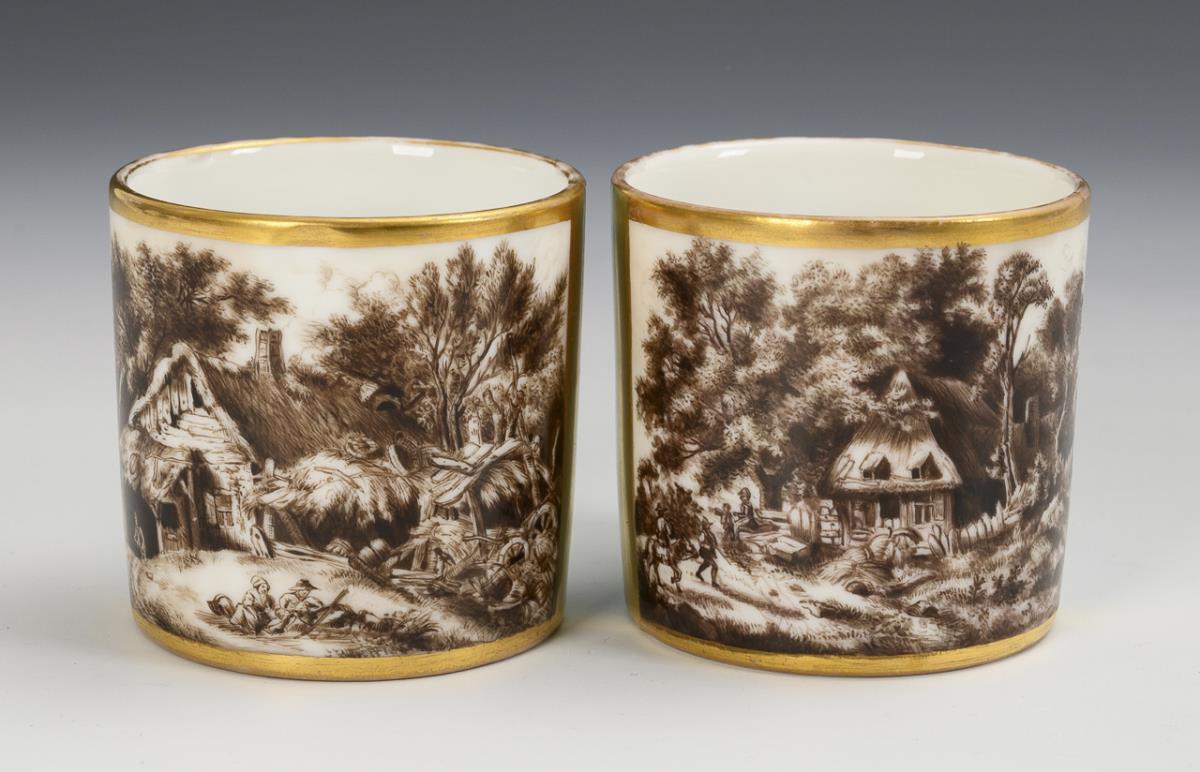 Zylindertassen mit gewinkeltem Henkel. Mintgrüner Fond, schauseitig auf den Tassen eine goldgerahmte Rechteckkartusche mit den in Brauncamaieu gemalten Darstellungen von alten Bauernhäusern in einer Waldlandschaft. Partieller Goldabrieb.