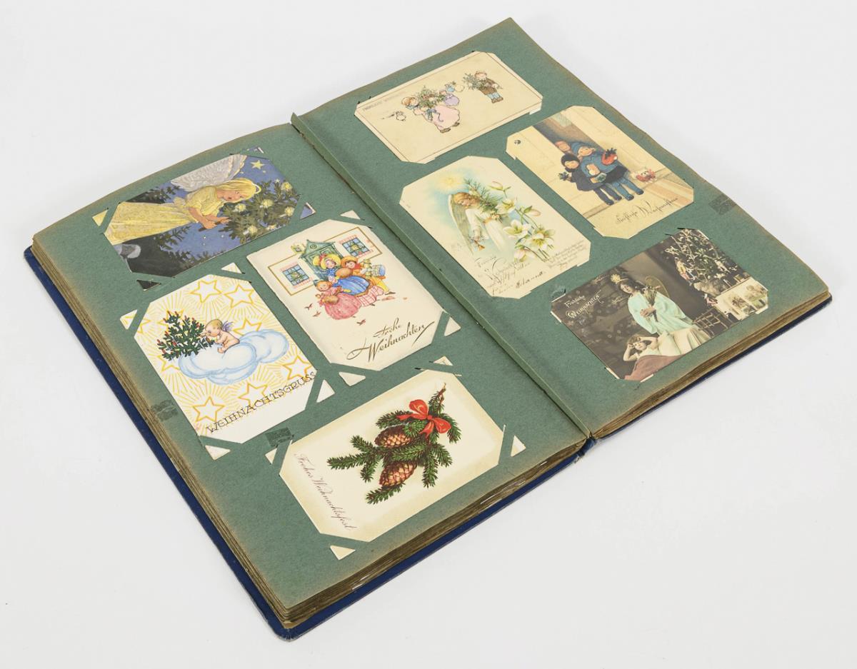 Postkartenalbum mit Weihnachts- und Neujahrskarten.