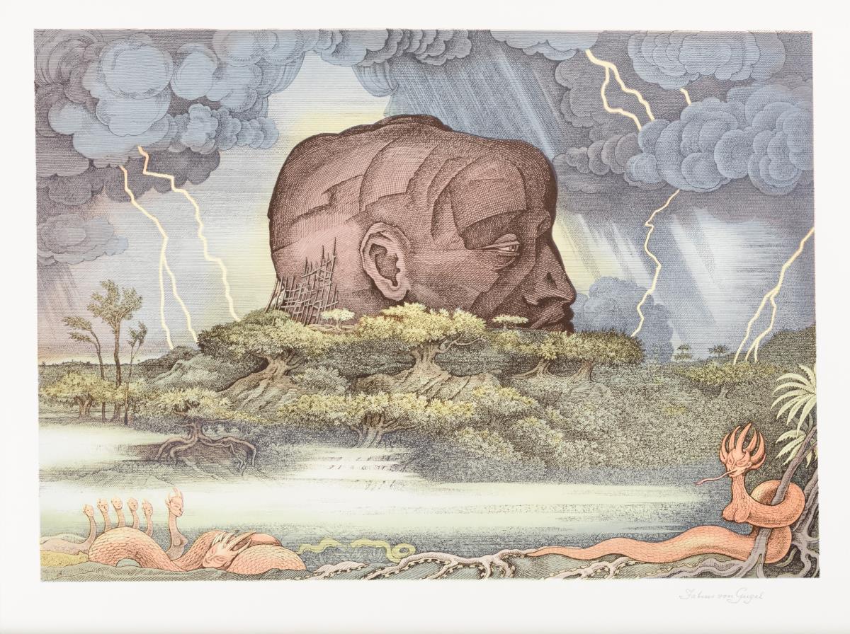 Fantastisch-surrealistisches Werk mit einem Felsen in Form eines Kopfes.