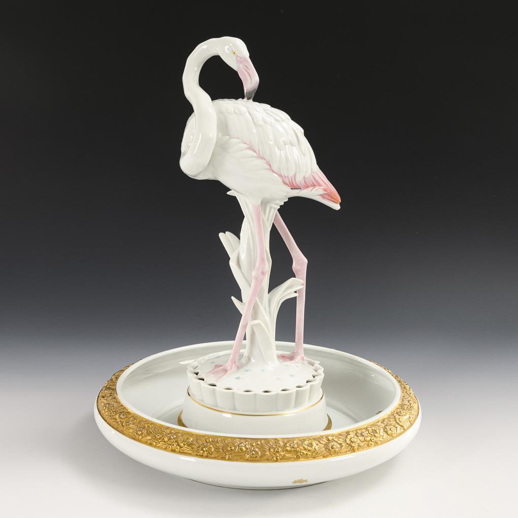 Auf einem Rundsockel mit durchbrochenem Rand stehender, sich das Gefieder putzender Flamingo sowie eine runde Schale mit goldstaffiertem Blütenreliefrand.