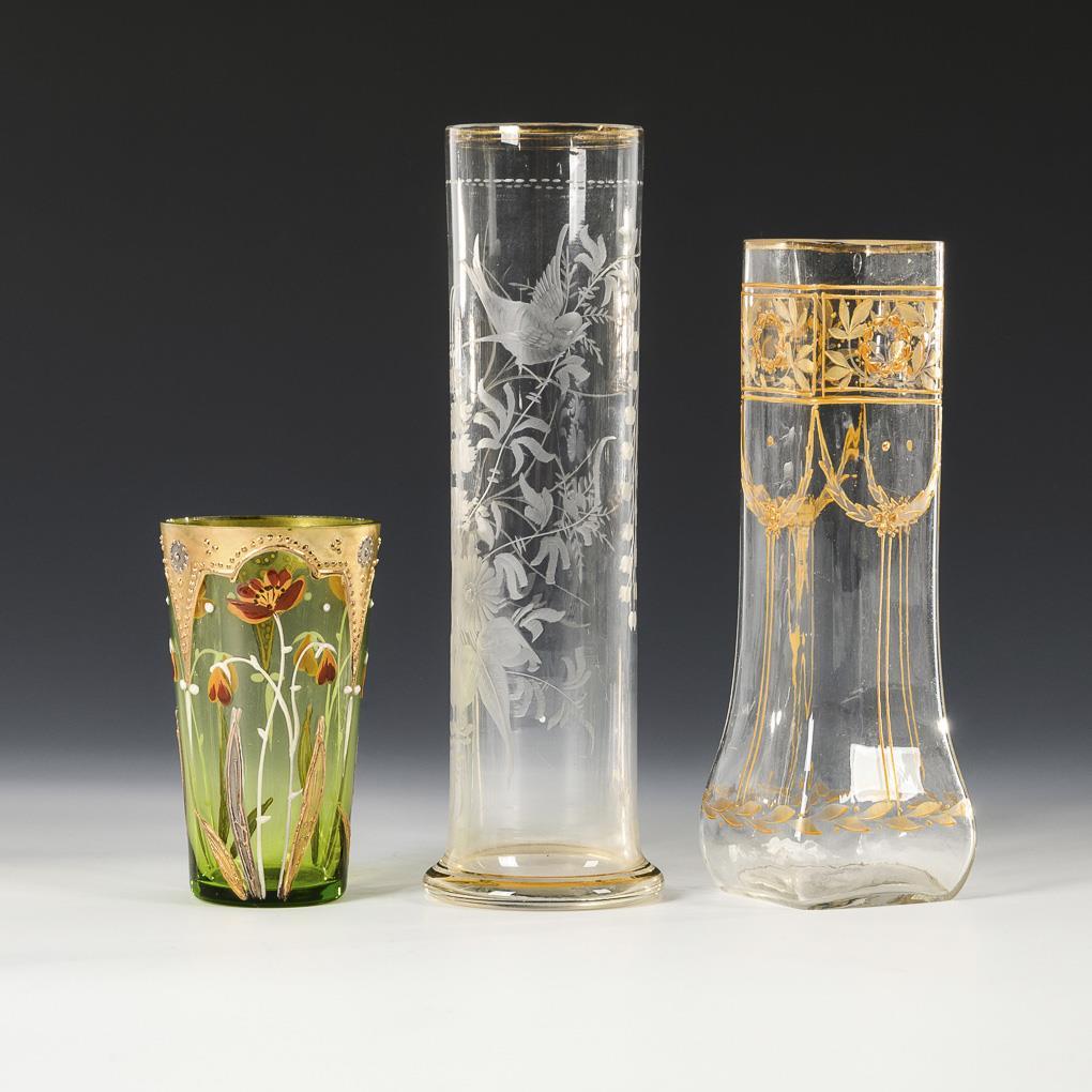 1x Stangenvase aus farblosem Glas mit einem gravierten Blumenbukett mit Vogel (H 20,5 cm). / 1x quadratische Stangenvase mit ausgestelltem Stand und email- und goldgemalten Lorbeerkränzen und -festons (H 17,5 cm). / 1x Becher aus grünem Glas mit floraler Gold- und Emailmalerei (H 10 cm). Gold teils berieben.