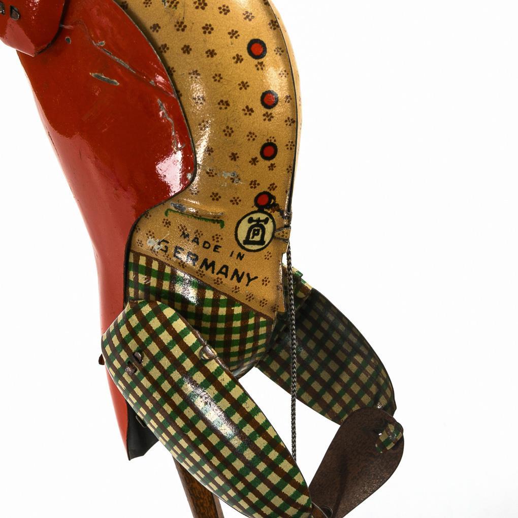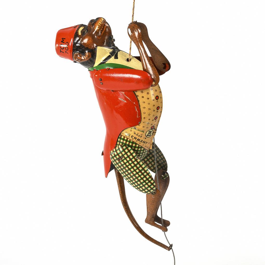 Affenfigur mit beweglichen Gliedern, die mit Hilfe von Schnüren bewegt werden können. Als Page rot bekleidet. Mechanismus intakt, kleine Lackdefekte.