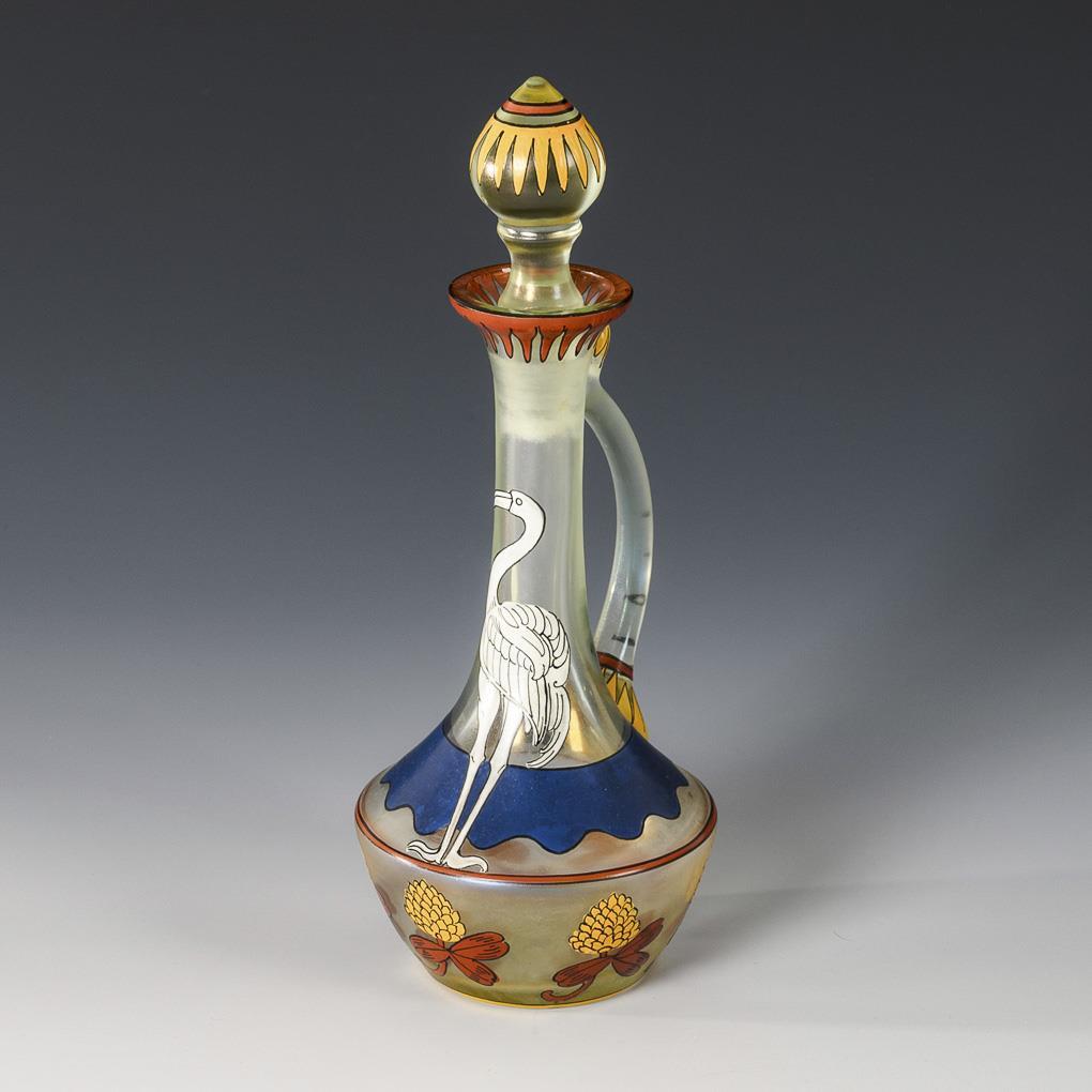 Bauchiger Korpus, Enghals, Stopfen. Mit der opakemailgemalten stilisierten Darstellung eines Flamingos sowie eines Blütenbandes. Minimaler Farbabplatzer am Mündungsrand.