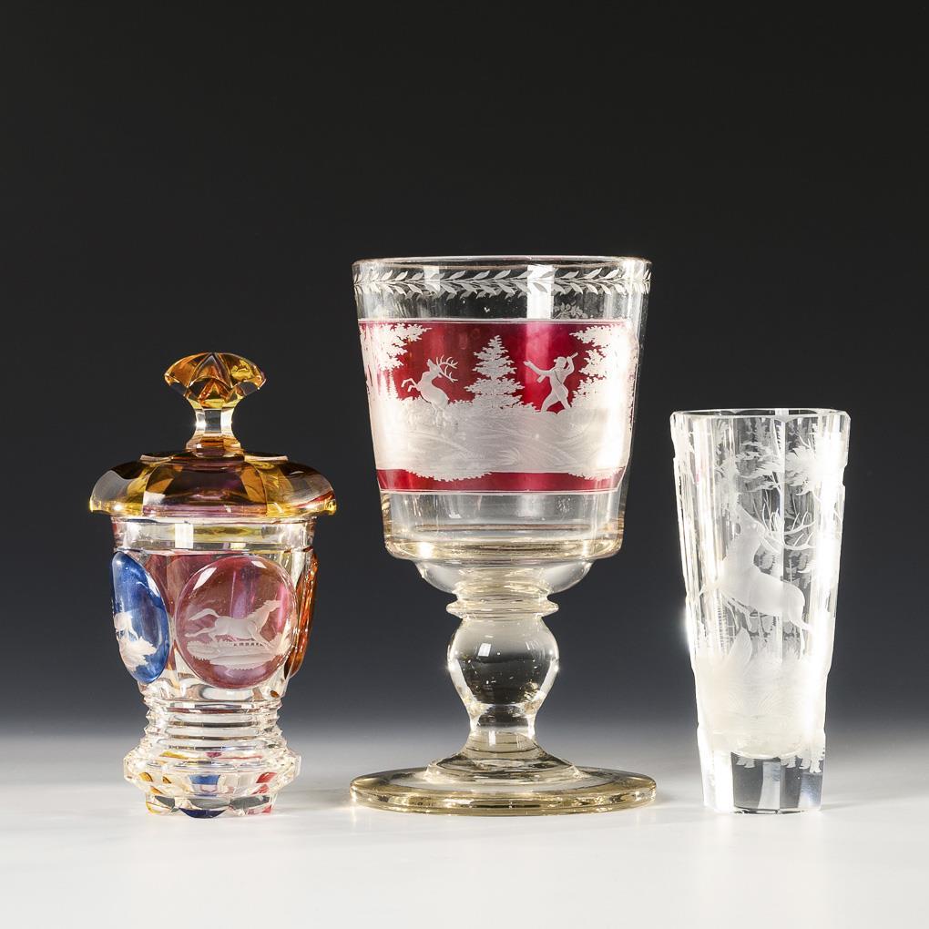 1x Jagdpokal aus farblosem, teils rosa gebeiztem Glas: konische Kuppa, massiver Balusterschaft und Rundfuß, schauseitig die Darstellung einer Waldlandschaft mit Jäger, Hunden und Hirsch, verso der Spruch "Jeder Trunk Erquwike Dich" (H 21 cm). / 1x facettierter Deckelbecher aus farblosem, mehrfarbig gebeiztem Glas mit originalem (?) Knaufdeckel, in hochgeschliffenen Medaillons die Darstellung eines Hirsches, eines Pferdes und eines Hundes (H 17 cm). / 1x konischer, facettierter Becher mit der tiefgeschnittenen Darstellung einer Waldlandschaft mit Hirsch und Reh (H 15 cm). Mündungsrand und -stand des Bechers minimal bestoßen.
