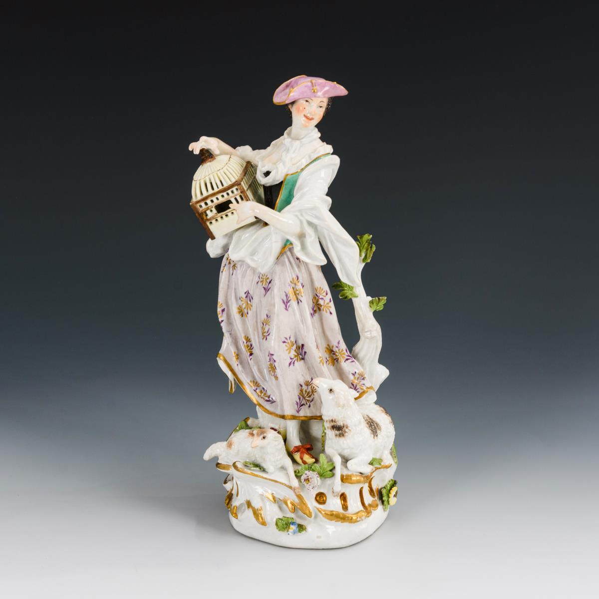Auf einem Rocaillesockel stehende Schäferin mit Vogelbauer und 2 Schafen. Restauriert.