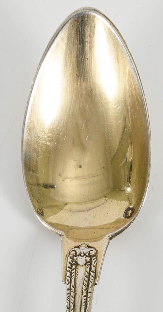 Elegante Löffelchen mit geschweiftem Griff und kleinem Blattmotiv am Griffende. Verso verschlungene Monogrammgravur. Reste einer Vergoldung.