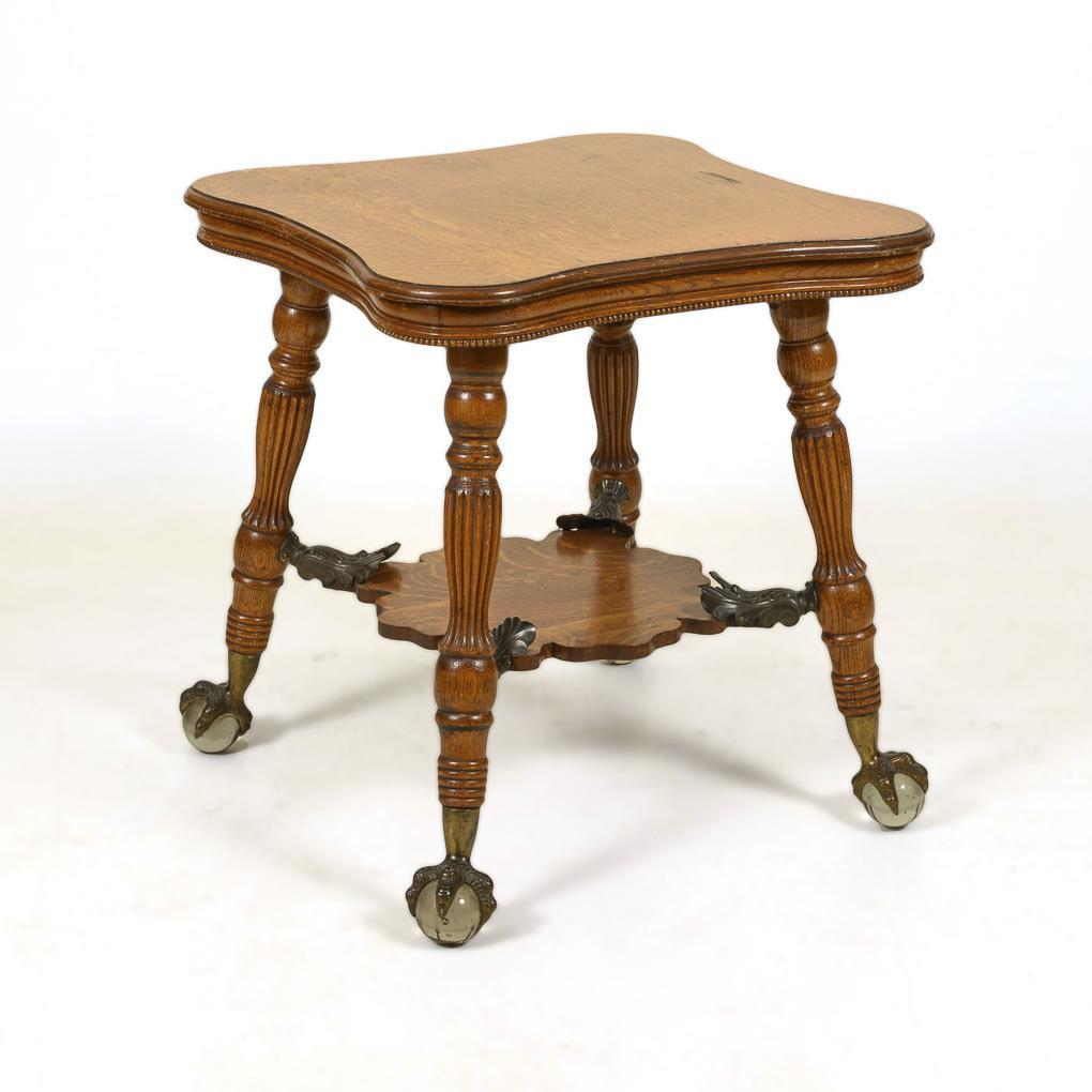 Quadratische Deckplatte mit konkaven Seiten und gerundeten Ecken, profilierte Zarge mit Kehlungen und Perlband, auf 4 Drechselbeinen mit geschweifter Zwischenablage, Halterung durch Bronze-Blätter, Bronze-Krallenfüße mit Glaskugelabschluss. Leichte Alters- und Gebrauchsspuren.