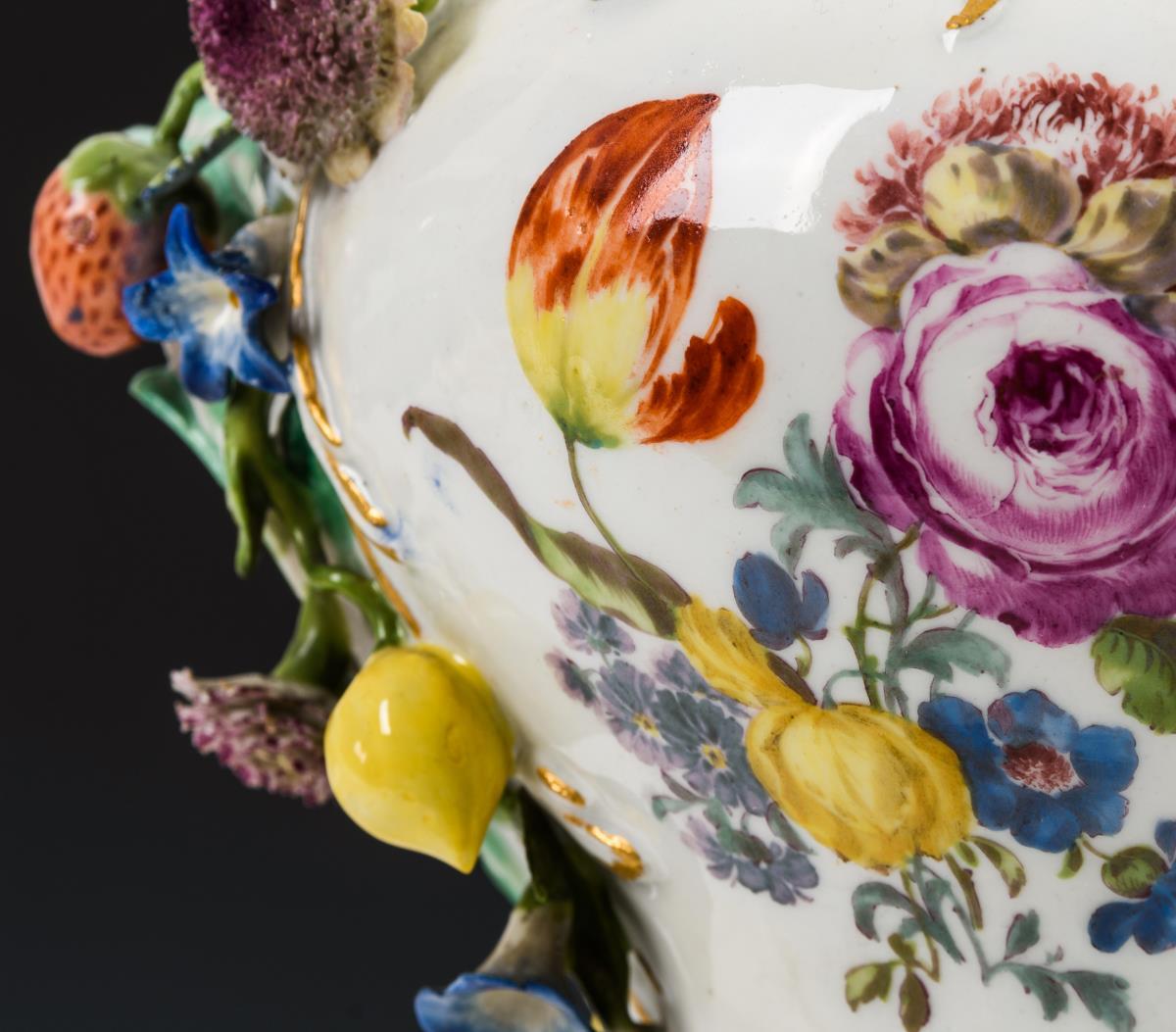 Balustervase mit Rocaillerelief, reichem Blüten- und Fruchtbelag sowie durchbrochen gearbeitetem Deckel mit einem Blumen- und Fruchtbukett als Bekrönung, an der Vase zwei Putten sitzend. Bestoßungen und Restaurierungen am Belag, 1x Puttenflügel restauriert, kleiner Brandriss am Mündungsrand.