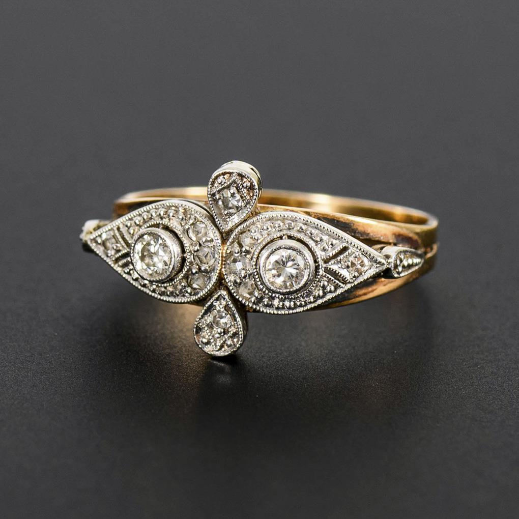 Millegriffesringkopf mit 2 zargengefassten Brillanten, 4 Diamanten und 6 kleinen Rosendiamanten. Mittlere Schiene.