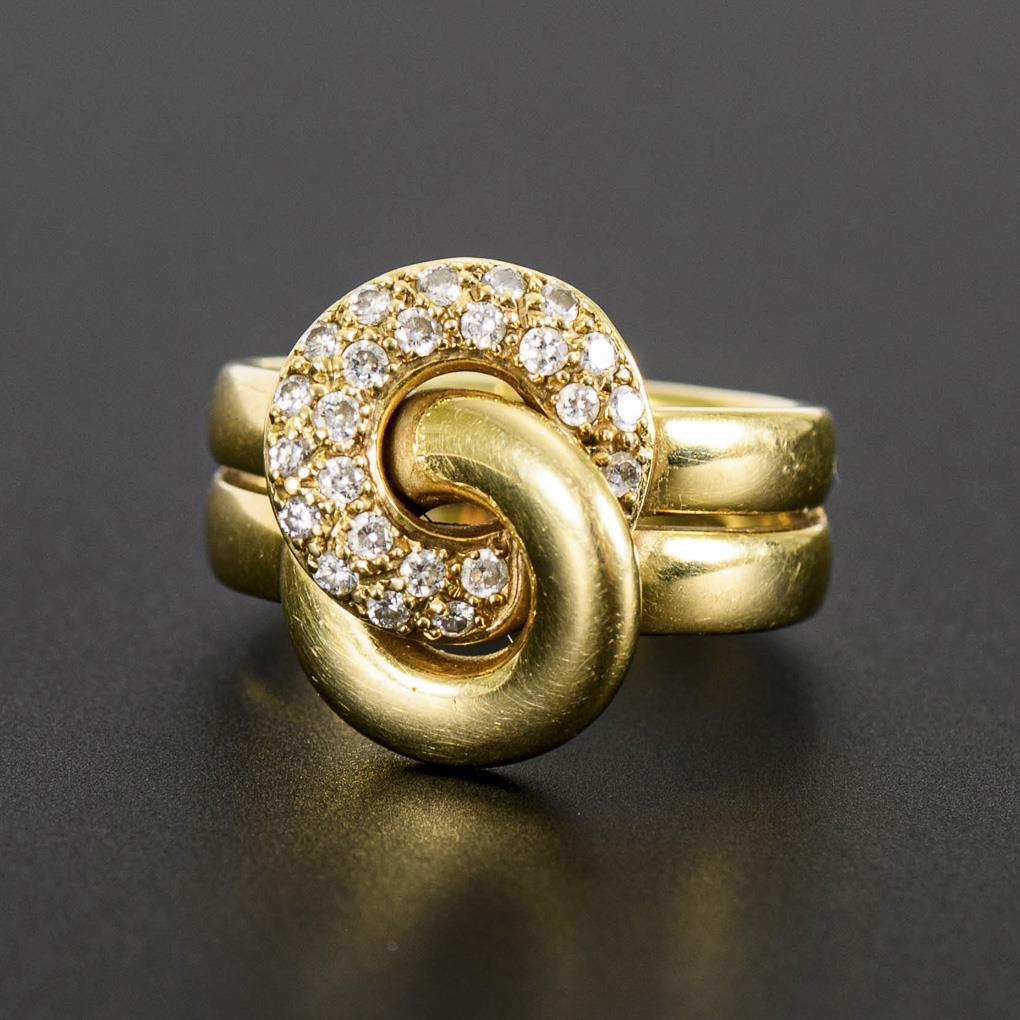 Doppelringmitte mit 24 kleinen, pavégefassten Brillanten, auf breiter Schiene.