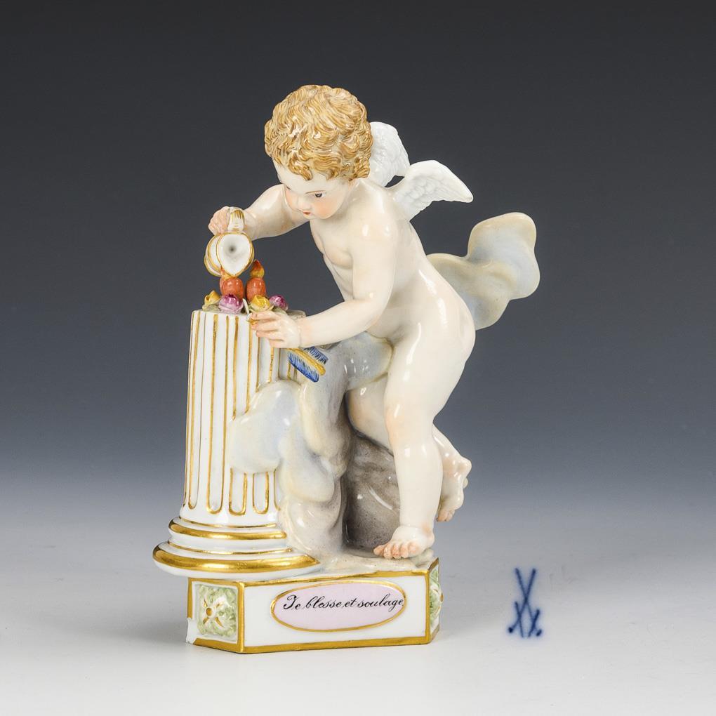 Zwei Herzen auf einem Säulenstumpf begießender Amorknabe. Pfeilspitze und 2 Blätter bestoßen, kleine Bestoßung an 1 Flügel, herstellungsbedingte Bestoßung am Sockel (unter dem Goldrand).