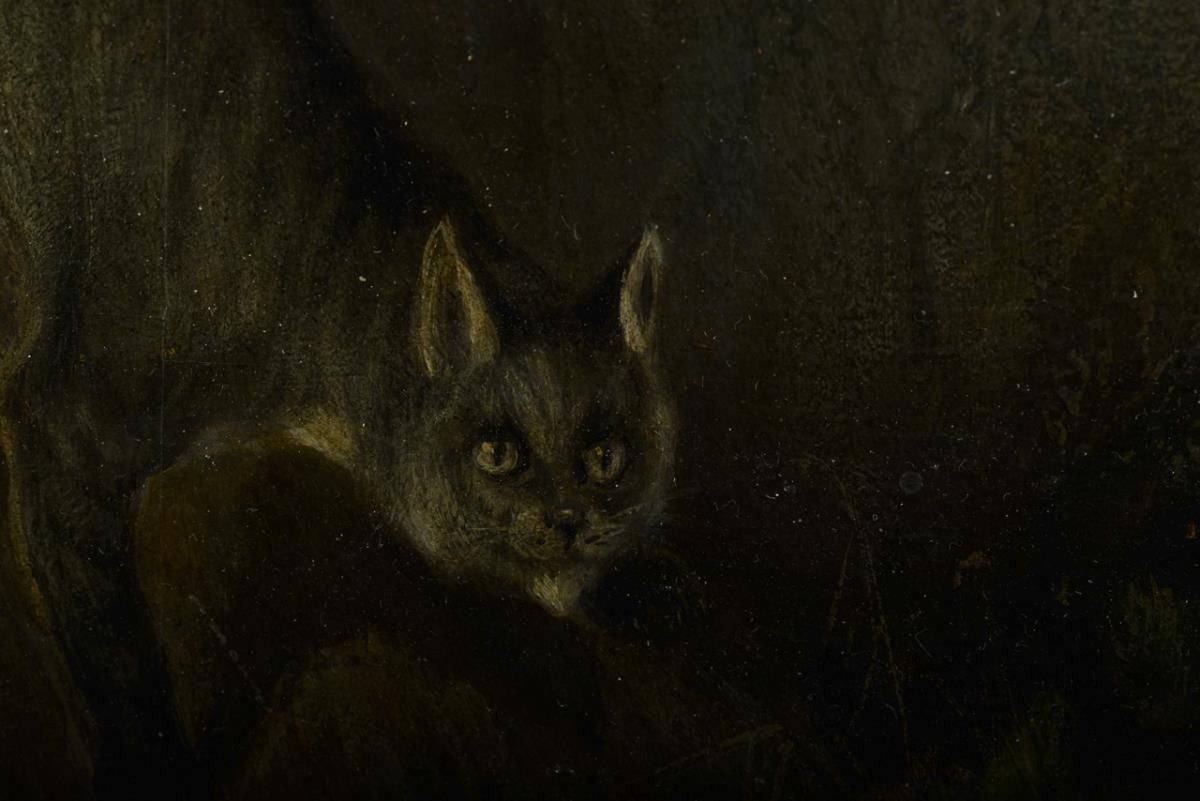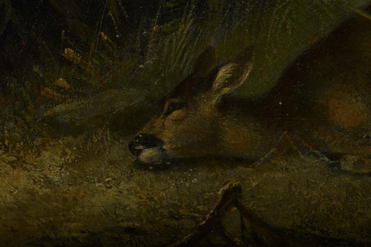 Sterbendes Reh unter einem toten Baum mit der sich nähernden Katze.
