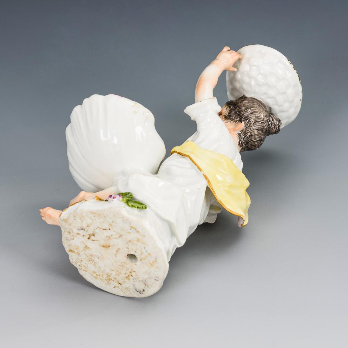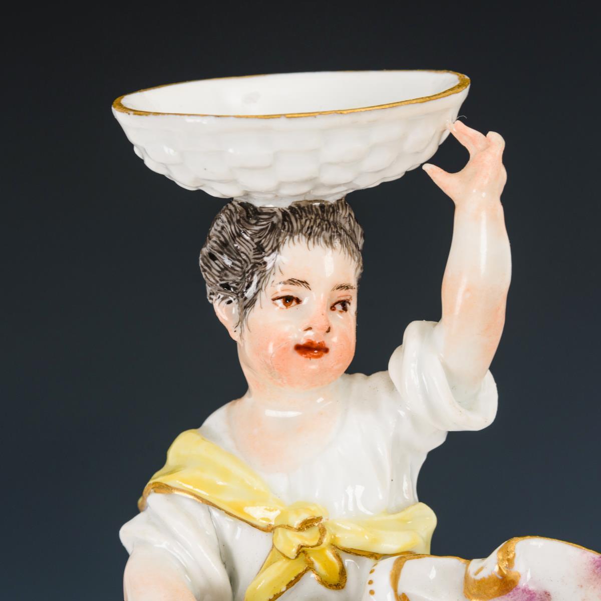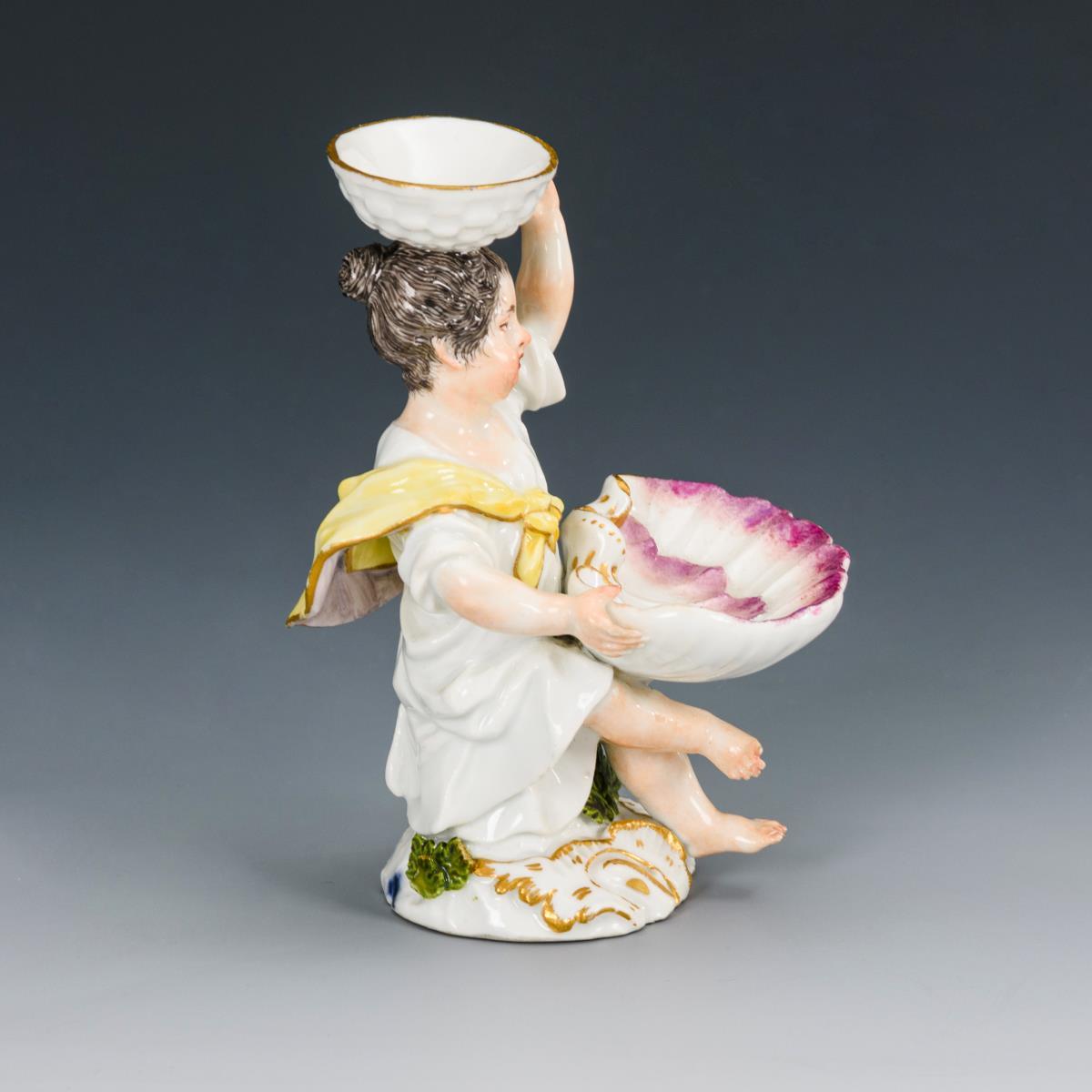 Sitzendes Mädchen mit Muschelschale, auf dem Kopf eine Korbschale haltend. 2 Fingerspitzen und 2 Blätter bestoßen, Bereibung an der rechten Wange. Kleine Restaurierung am Rand der Muschelschale.