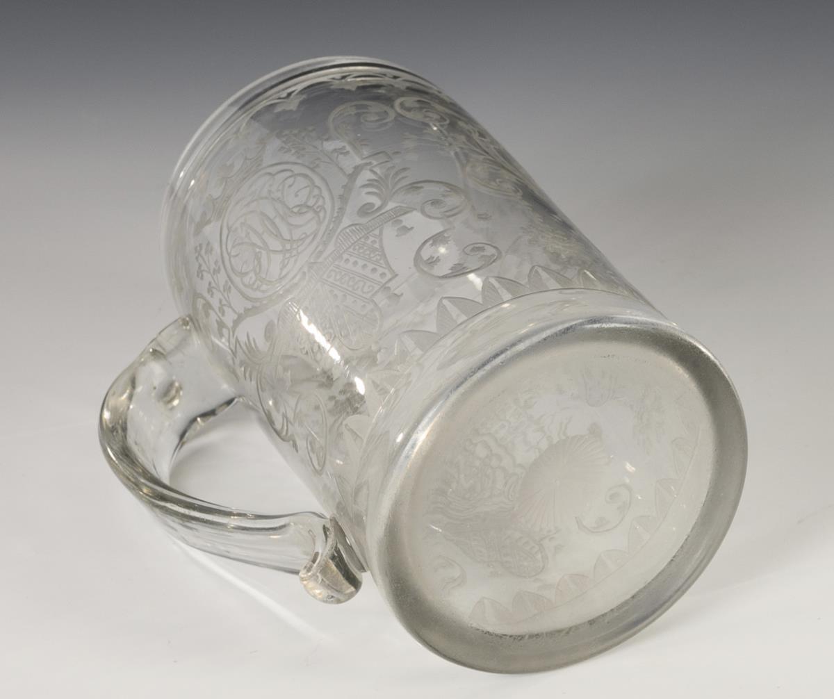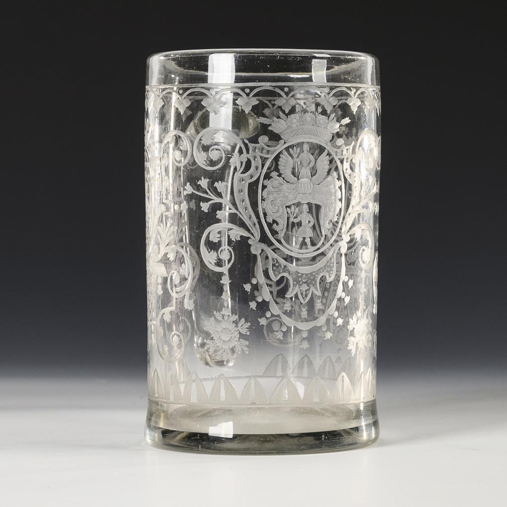 Zylinderkrug mit Bandhenkel. Auf der Wandung zwischen graviertem Bandelwerk ein Wappen sowie zwei ligierte Monogramme; ausgeschliffener Abriss.