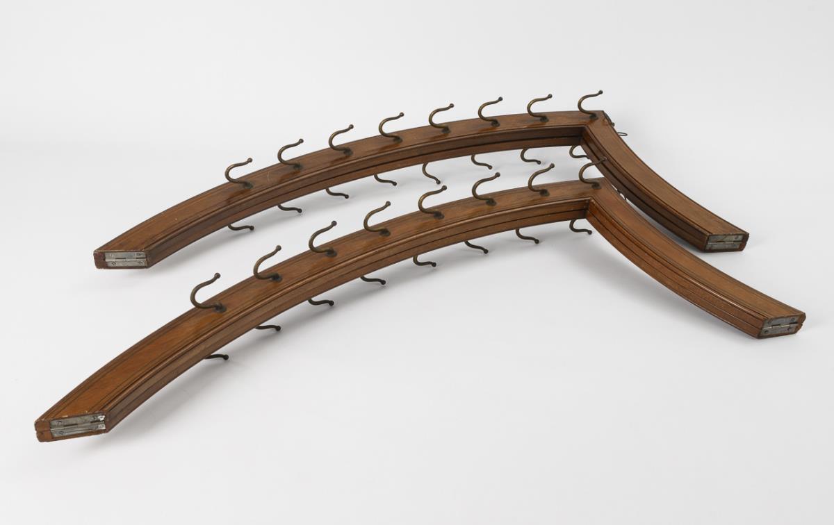 Zusammenklappbare Rahmen mit je 16 Haken für 8 längliche Gegenstände. Minimale Alters-/Gebrauchsspuren.